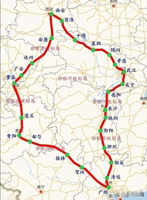 未来西安至广州的2条主要高铁通道中,印证了省会优势巨大。两条高铁都是绕道而行,而不是直接下湖南省怀化市到广州。 一通道:由西安出发,绕道经重庆和贵阳,终点广州。 二通道:由西安出发,也是绕道经武汉和长沙,终点广州。