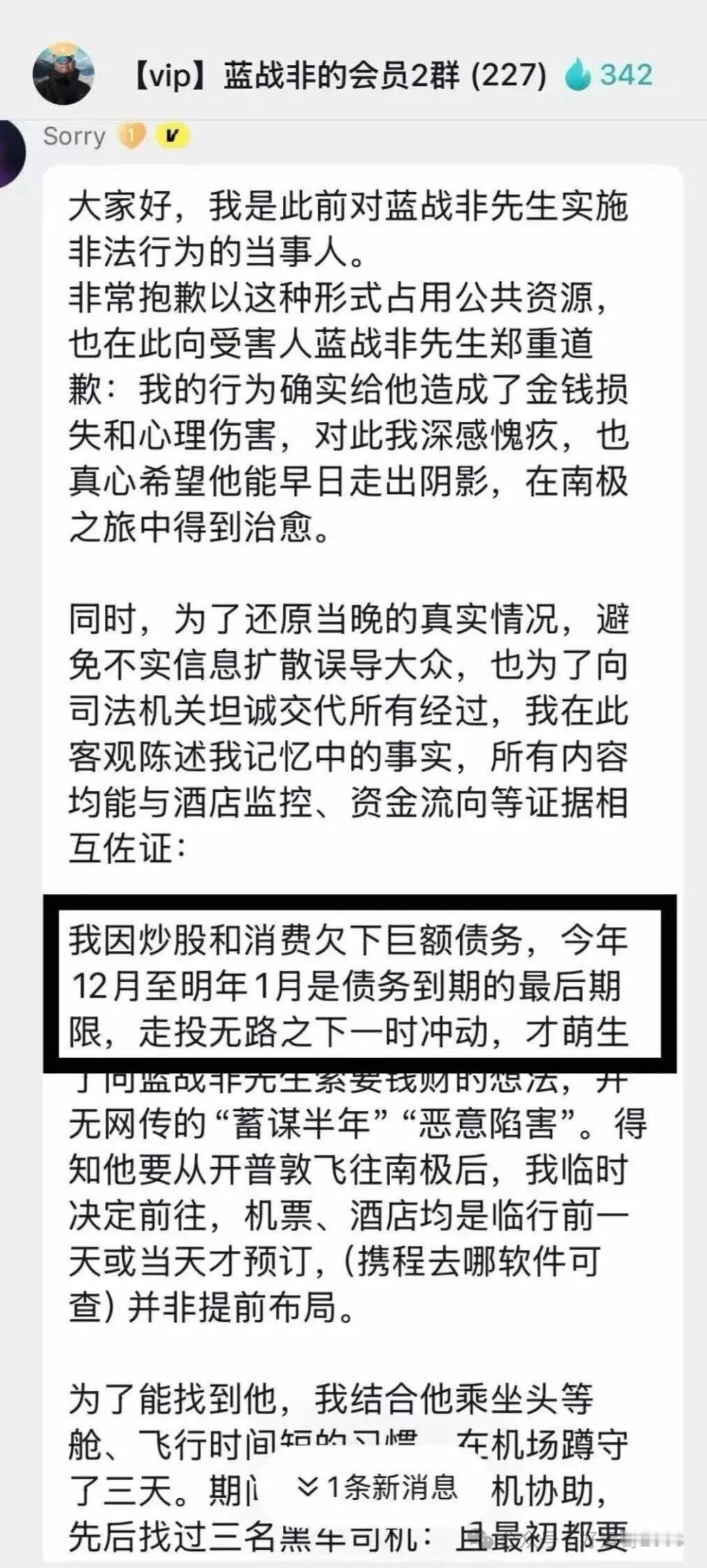 奇葩绑匪自曝喊冤?蓝占飞绑架案反转闹剧,洗白不了犯罪的底色! 一边晒借条、谅解书扮“仁义侠盗”,一边把入室抢劫说成“借钱”,蓝占飞绑架案绑匪的自曝小作文,堪称年度最荒诞洗白大戏。但再多花言巧语,也掩盖不了持刀(道具枪)索财的犯罪本质,受害者不必完美,可犯罪绝不能被浪漫化。 蓝占飞绑架案出现离奇反转,自称绑匪的人发声,称自己不是预谋作案,只是临时起意在机场蹲守3天,冒充蓝占飞补办房卡入室,用道具枪和防狼喷雾“借钱”108.8万元,全程无肢体接触,还留下应急钱、下跪致歉,甚至晒出转账截图、谅解书等“证据”,试图将抢劫粉饰成无奈之举。 这番说辞看似有理,却漏洞百出:南非签证无法临时办理,道具枪在当地比真枪还难获取,所谓“无预谋”更与跨国蹲守、补办房卡的缜密操作自相矛盾,显然背后另有隐情。 绑匪的洗白套路,实则是精心编织的谎言。拿着武器逼迫他人交出钱财,本身就是赤裸裸的抢劫,所谓“借条”不过是犯罪后的遮羞布。更讽刺的是,竟有网友被这番说辞带偏,反过来指责受害者。 这起闹剧警醒所有人:法律的底线不容践踏,任何美化犯罪的行为,都是对受害者的二次伤害。真相或许会迟到,但绝不会缺席,最终定论还需等官方通报,而绑匪的荒诞辩解,不过是跳梁小丑的垂死挣扎。