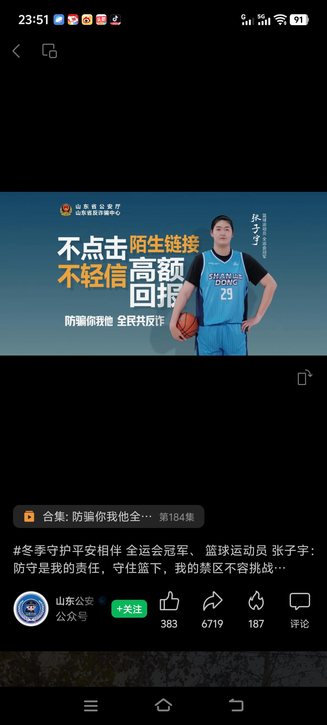 济南小妮张子宇,篮球训练之余不忘回报社会,做防电信诈骗公益广告,标准的普通话,人人都愿意听;手握篮球的大个子,人人也愿意看。 与山东高速鉴约后,张子宇投入到了大运动量的训练之中。在山东省公安厅的公益广告短片中,也展示了张子宇的部分训练和比赛过程。