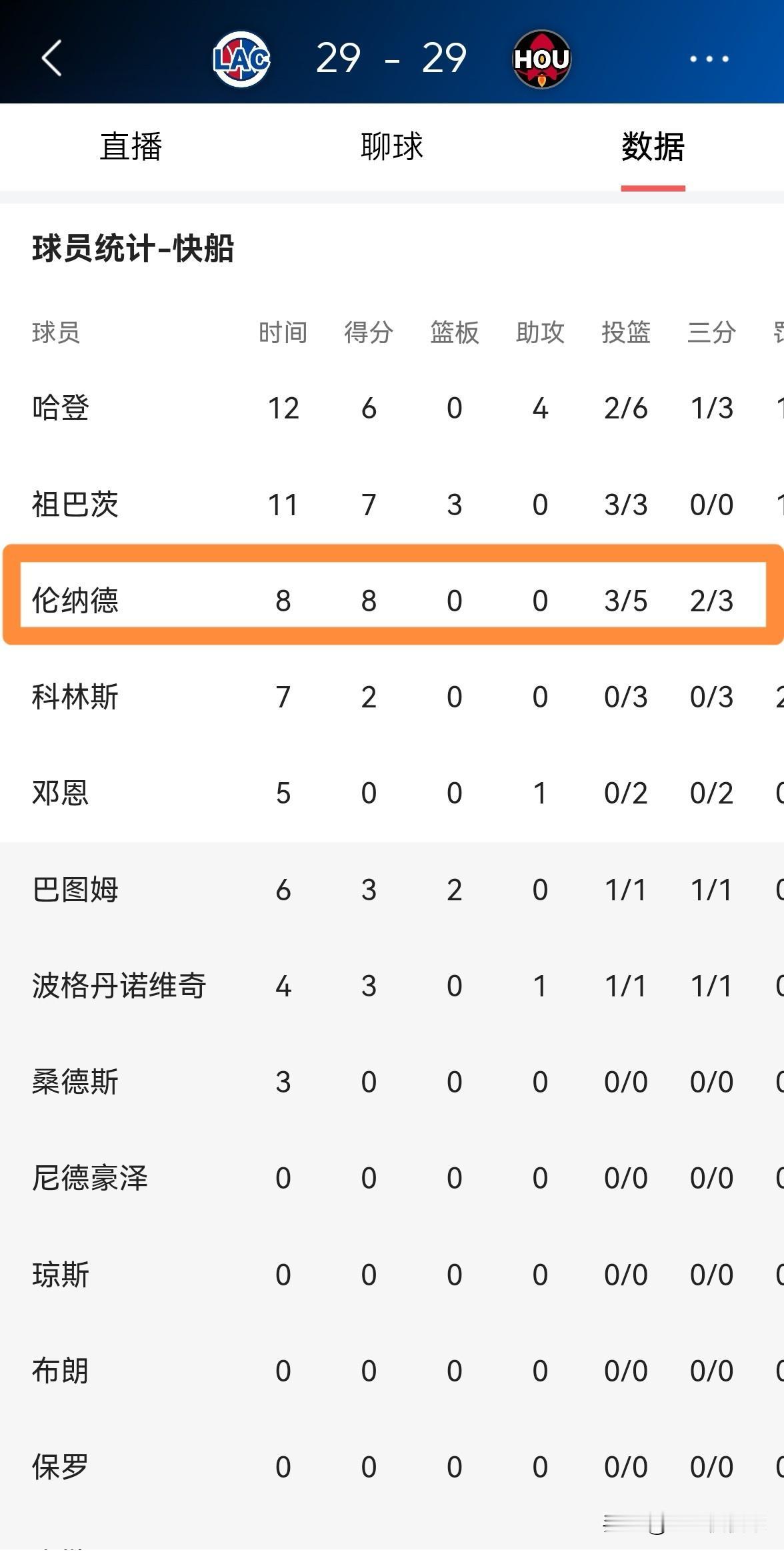 快船当家球星伦纳德的手感真是太火热了!在今天快船客场挑战火箭的比赛中,目前双方的第一节比赛已经结束,双方战成了29平。值得一提的是,在首节比赛中,伦纳德的手感非常火热,他在首发出战的8分钟里,投篮5中3,其中三分球3中2得到8分。 如果伦纳德能够在接下来的三节比赛中延续这样的火热手感,那么快船很有可能会赢下这场焦点战。