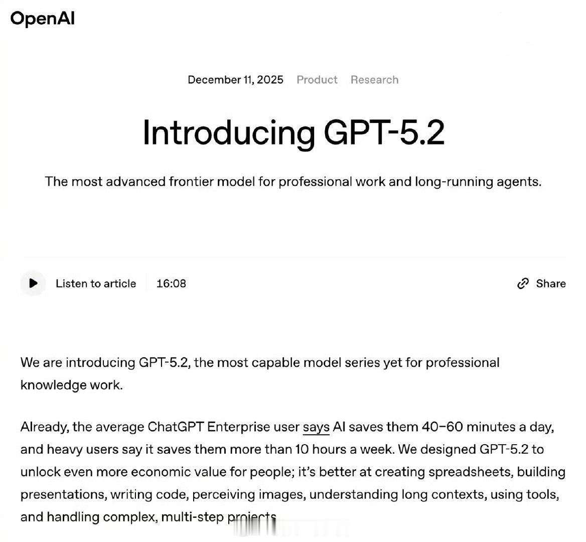 OpenAI 正式发布前沿模型 GPT-5.2。官方将这款模型定位为迄今最先进的模型,专为开发者和专业用户而打造。 openai308_IO人工智能