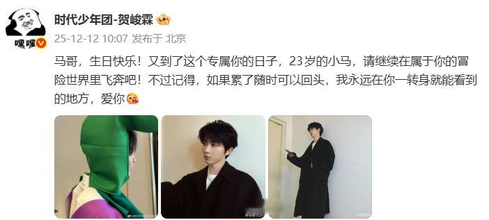 贺峻霖给马嘉祺庆生: “马哥,生日快乐!又到了这个专属你的日子,23岁的小马,请继续在属于你的冒险世界里飞奔吧!不过记得,如果累了随时可以回头,我永远在你一转身就能看到的地方,爱你😘 ”