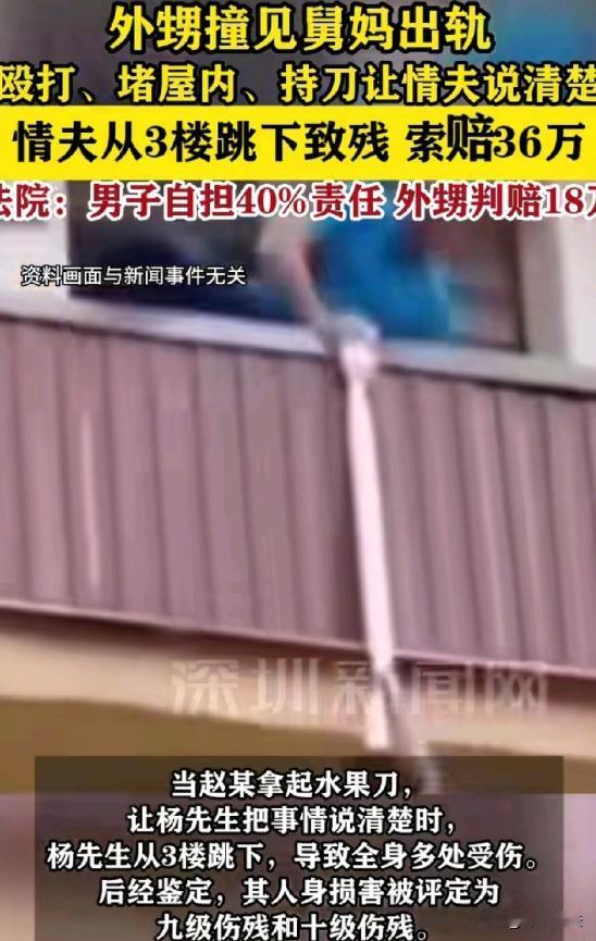 云南玉溪,36岁的杨先生,和有家庭的43岁杨女士在异乡相识,常在出租屋私会。当晚,赵某到舅妈杨女士出租屋,发现杨先生后质问,两人争吵,赵某动手还拿水果刀逼问,杨先生跳楼致九级伤残。事后杨先生索赔36.4万,法院判赵某赔偿18.3万余元,二审维持原判。 据极目新闻报道:去年6月,36岁的杨先生和43岁有家庭的杨女士在异乡碰上了,一来二去就熟络起来,还常常在杨女士的出租屋里偷偷私会。 10月22日晚,杨先生待在杨女士的出租屋里时,赵某来找自己的舅妈杨女士。 一推开门,就看到杨先生在里面,赵某当时就火了,直接质问杨先生:你跟俺舅妈什么关系?这么晚了,在这里干什么。 杨先生心里有点发虚,想着赶紧走,可赵某哪能让他走,直接就把他给堵住了。 这两人一下子就吵起来了,赵某一激动,上手就打了杨先生,还掐住了他的脖子。 杨先生拼命挣脱,可还是被堵在屋里出不去。 赵某还不解气,转身拿了把水果刀,逼问杨先生。 杨先生当时被吓得慌得不行,杨先生一看这情况,实在没办法了,就爬上了窗户,直接跳了下去。 杨先生臀部着地,当时就疼得嗷嗷叫,赵某和杨女士也吓了一跳,赶紧跑过去查看情况,还报了警。 可杨先生,也不知道是害怕,还是怎么回事,骑上自己的车就跑了。 第二天,杨先生实在是疼得受不了了,才去检查。 这一看可不得了,花了好多钱不说,还被鉴定为九级伤残。 杨先生觉得这一切都是赵某造成的,赵某事后就只给了杨先生2008块钱。 杨先生把赵某告上了法庭,要求赵某赔偿36.4万。 有人就说,杨先生明知道杨女士有家庭,还跟她搞在一起,这本身就不对。 您觉得杨先生这种行为,该被指责吗? 还有人说,赵某也太冲动了,动手打人还拿刀逼人,这要是出了人命怎么办呢? 您在生活中遇到这种冲动的人,会害怕吗? 从法律角度来说,这责任到底该怎么划分呢? 杨先生觉得自己受伤都是赵某造成的,赵某得全赔。可赵某觉得,杨先生自己跳楼,这能怪自己吗? 您觉得赵某该不该赔钱呢? 杨先生和有家庭的杨女士保持不正当关系,这在道德上就不对。 后来赵某和杨先生发生冲突,杨先生跳楼受伤,双方在责任承担上产生了分歧。 那么,法律上是怎么规定的呢? 杨先生自己跳楼受伤,赵某要不要负责? 根据《民法典》规定,行为人因过错侵害他人民事权益造成损害的,应当承担侵权责任。 赵某堵门不让杨先生离开,还拿水果刀逼问,这种行为存在过错,而且和杨先生跳楼受伤有直接的因果关系。 所以,赵某不能完全撇清责任。 那么,杨先生自己有没有责任呢? 杨先生作为成年人,应该对自己的行为负责。 他明知杨女士有家庭,还和她保持不正当关系,这本身就违背了公序良俗。 而且在跳楼的时候,他也没有考虑可能产生的后果,跳完楼还不顾劝阻就离开,导致伤势加重。 所以,他自己也得承担一部分责任。 根据《民法典》第一千一百七十三条规定,被侵权人对同一损害的发生或者扩大有过错的,可以减轻侵权人的责任。 杨先生自身存在过错,所以判决他自己承担40%的责任,赵某承担60%的责任。 最终,法院判赵某赔偿18.3万余元。 赵某对判决结果不服,提出上诉。 最终,二审维持了一审判决。 您对这件事有什么看法呢?