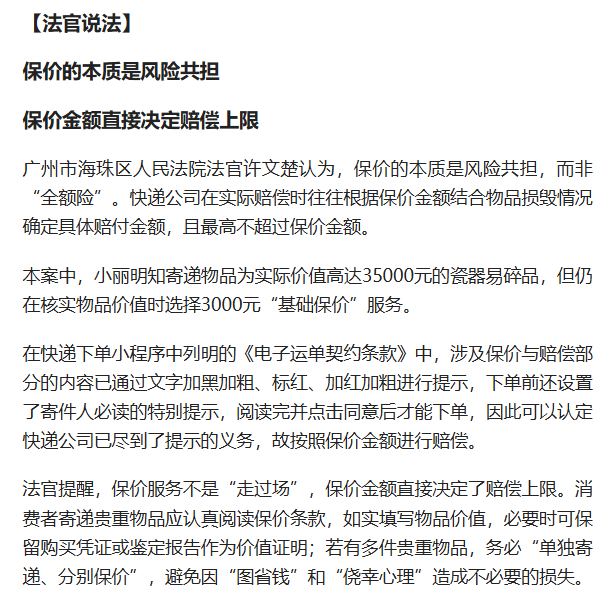 #上万古董快递损毁赔了3000#【上万元古董快递途中遭损毁,法院:保价金额直接决定赔偿上限】#保价3000买3.5万古董碎了谁担责#古董瓷器在快递运输途中损坏,快递公司如何担责?近日,广州市海珠区人民法院审结一起快递服务合同纠纷。小丽(化名)是一名古玩爱好者,她网购了一件古董瓷器笔筒,购买价格为35000元。在鉴赏期内,小丽与商家协商退货,并下单某快递公司上门取件。寄件时,小丽特意标注了寄件物品为古董瓷器,但在核实物品价值时,选择了基础保价服务,保价金额仅3000元。数日后,收件人当场拆封验货,发现古董瓷器笔筒在运输途中破碎损坏,因此拒绝签收。小丽认为快递公司存在重大过失,保价条款是“霸王条款”,要求快递公司全额赔付。快递公司表示仅赔付现金1500元及消费券500元。双方协商未果,小丽诉至法院要求快递公司全额赔偿损失35000元。广州市海珠区人民法院经审理后判决:某快递公司向小丽赔付3000元。该判决已生效。