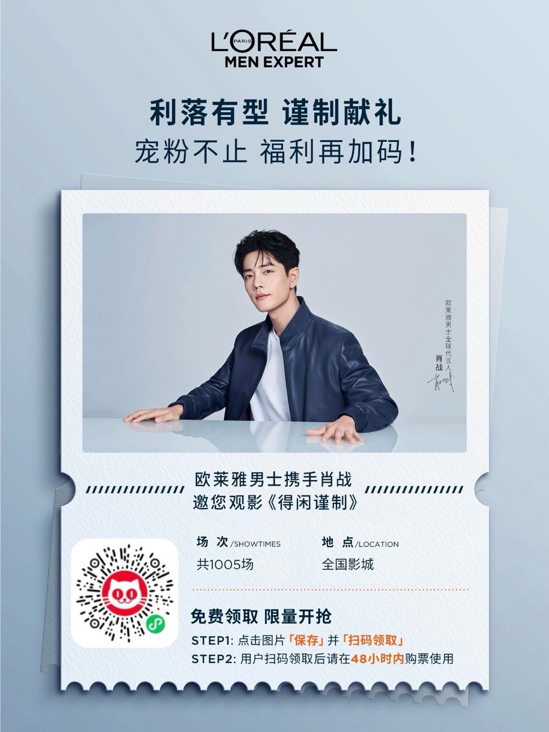 欧莱雅男⼠全球代⾔⼈肖战 太有实力了!肖战宣了没多久的新代言给他的新电影包到了1005场,品牌霸霸这波简直是宠粉+宠代言人的天花板级别操作欧莱雅男士包场1005场