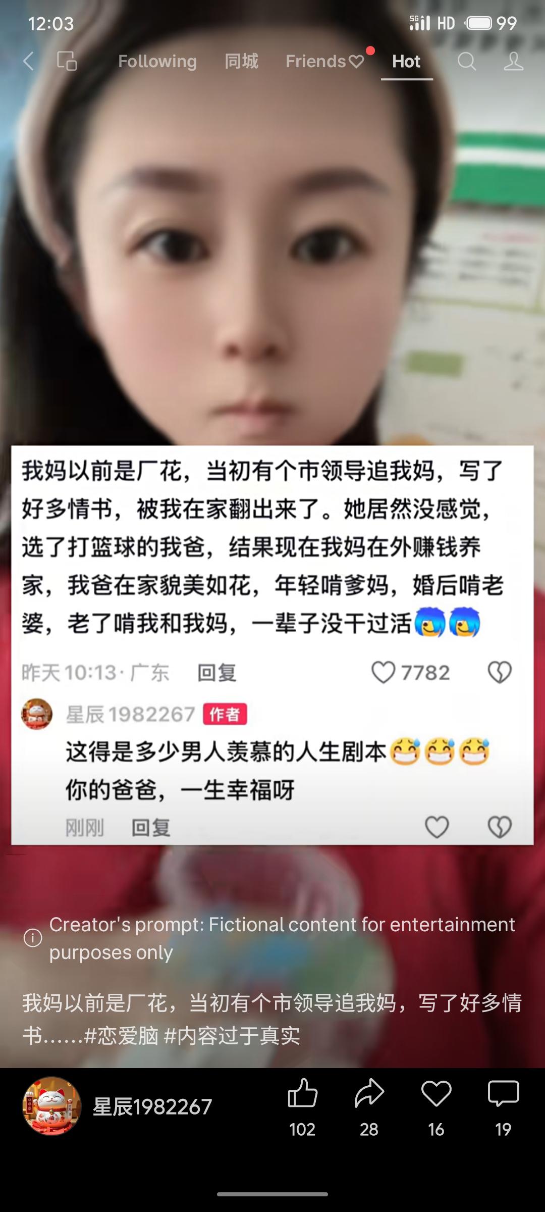 一则带有娱乐性质的社交媒体个人分享,以调侃语气讲述家庭故事:母亲年轻时放弃条件优越的追求者,选择爱情,却成为家庭经济支柱;父亲则长期依赖家人生活。内容引发对性别角色、家庭责任与“躺平”人生观的讨论,作者戏称其为令人羡慕的“人生剧本”。