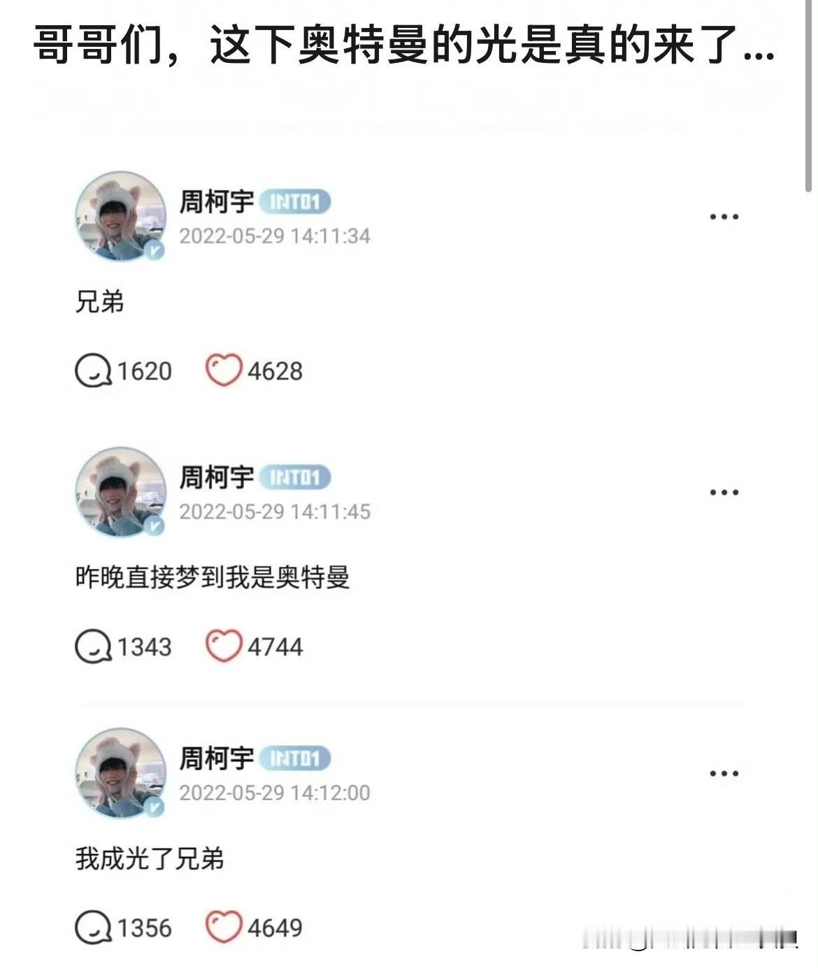 周柯宇是命运派来,替陈妍希「报仇」的天使吧。 剧中对陈妍希宠溺到爆,剧外callback她婚礼的片段,膈应陈晓。 陈晓粉丝以前最爱拿陈晓眼里没光,来谩骂陈妍希,说晓哥自从结婚后眼里就没光了。 结果周柯宇那个时间段在微博上写道, 「昨晚梦到我是奥特曼,我成光了!hh」 结合网友的评论, 「晓哥眼里没光了,陈妍希只能换个眼里有光的小奶狗了」 简直是绝杀啊!晓哥当初有多冷漠,现在就有多尴尬[呲牙][呲牙] 周柯宇