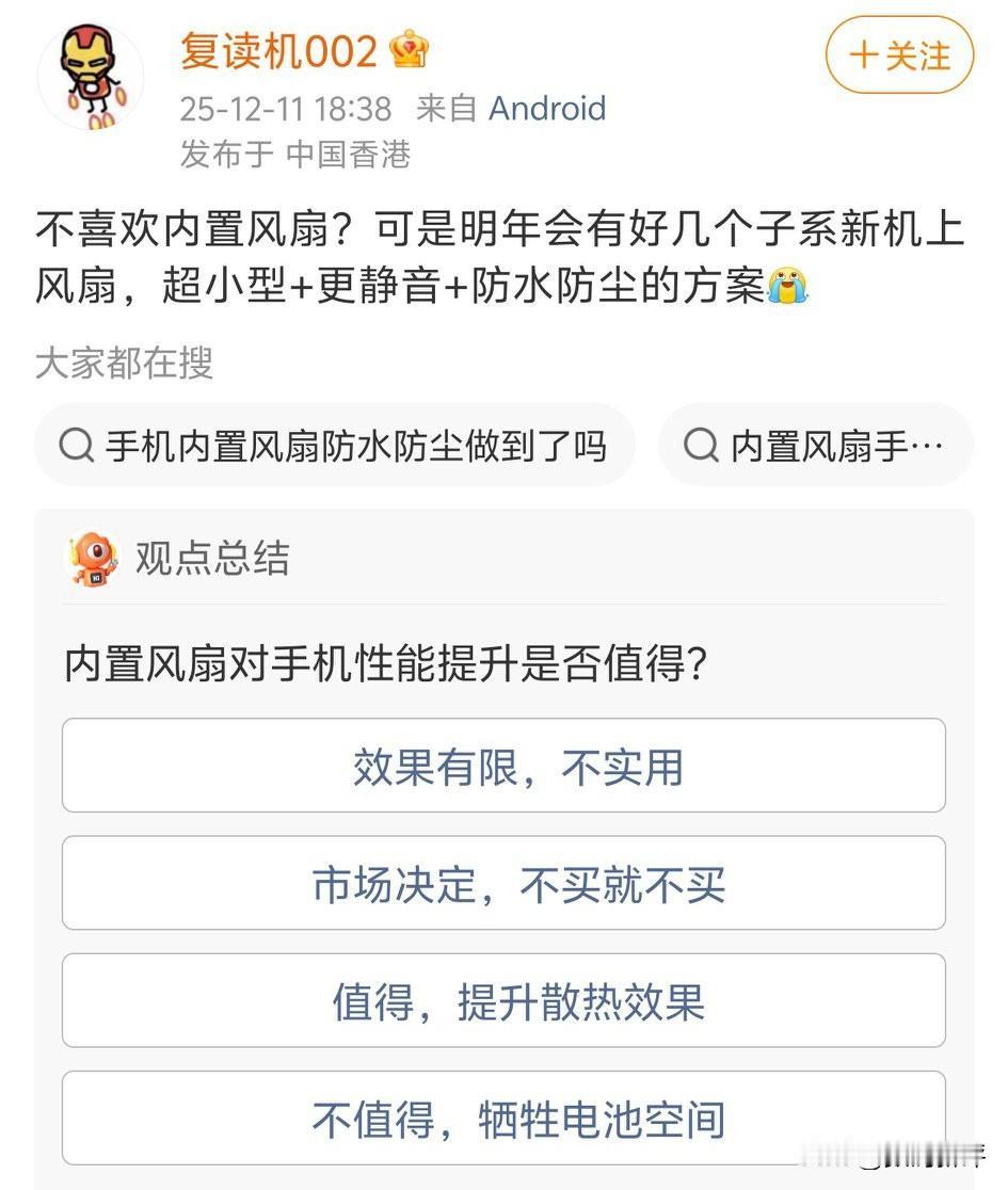 子系机型卷性能,还卷电风扇[笑哭]明年的子系性能机都会上风扇,注意是小型风扇,同时支持防尘防水,超声波指纹和超大电池卷完后,为了有新卖点,接下来就是卷性能释放,所以想到了内置小型风扇,同时还会卷超高刷165hz,2K分辨率+165hz高刷可能明年就有机型落地[灵光一闪]兼顾超大电池和外围配置,还会卷一卷轻薄度