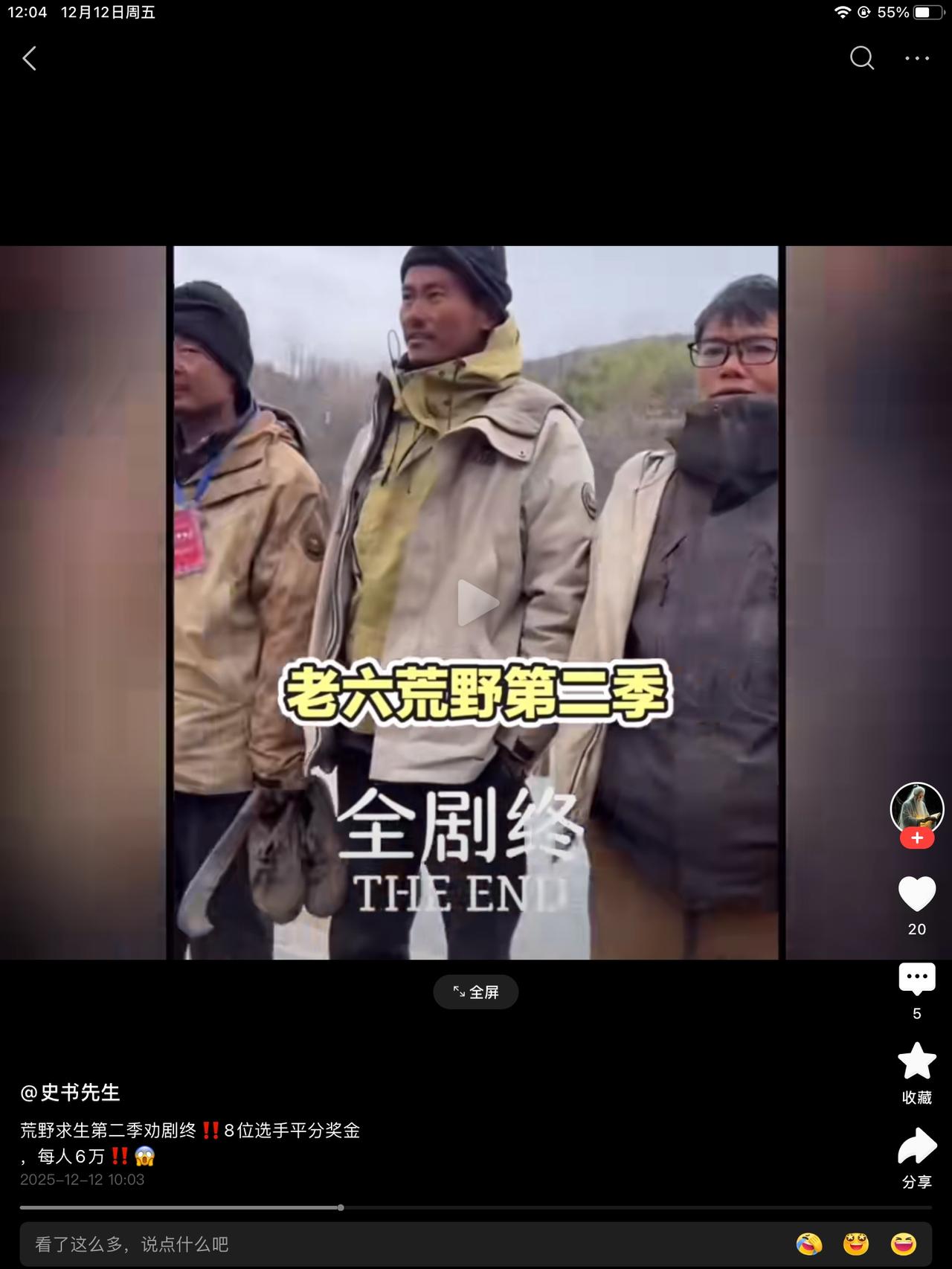 结束的太突然了,荒野选手8人平分48万。节目组还是挺有诚意的。赚的就赚了,亏的也