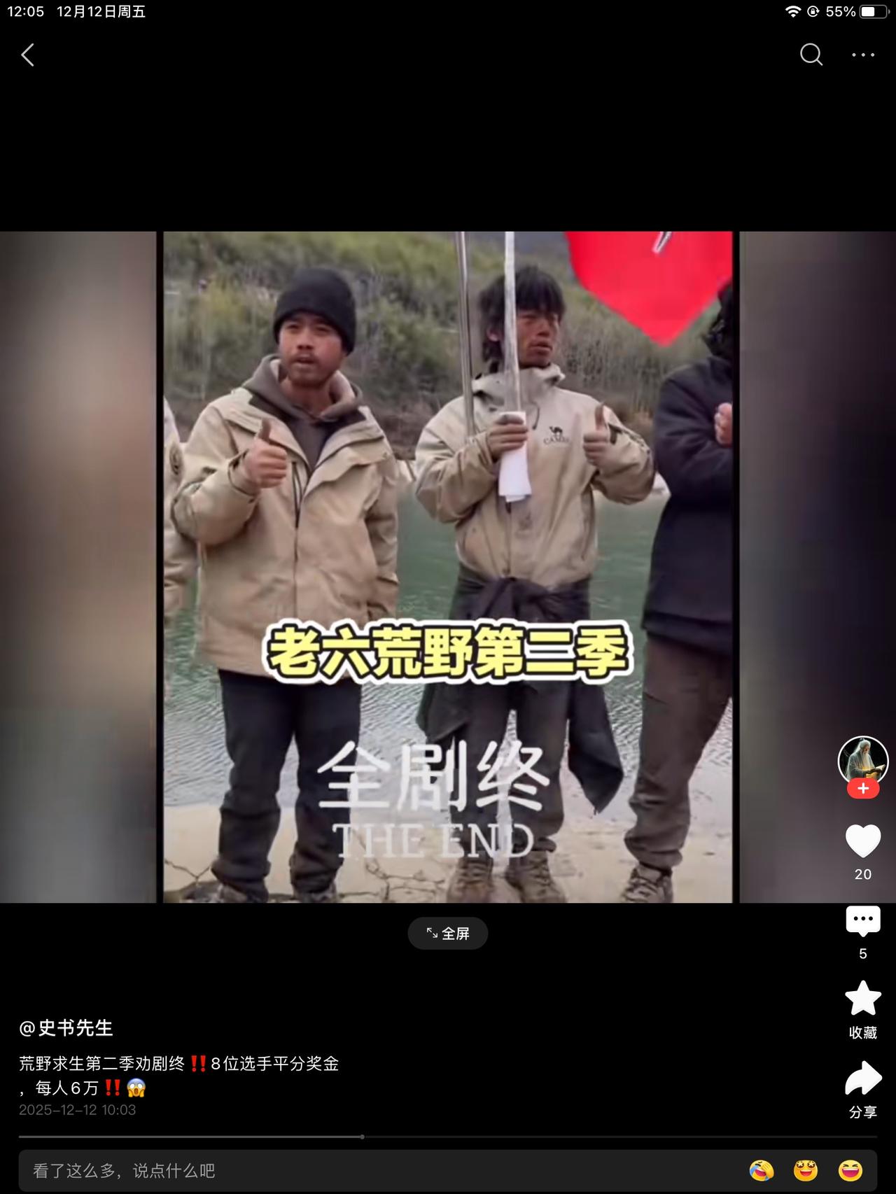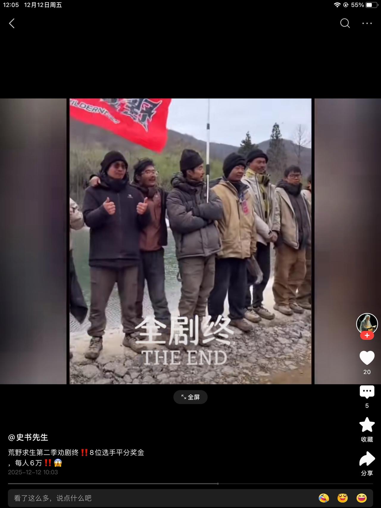 结束的太突然了,荒野选手8人平分48万。节目组还是挺有诚意的。赚的就赚了,亏的也无话讲,给的不少。多熬二十天,冠军是二十万。但二十天,真的不是好滋味。气温零下了。有火的选手还好。没🔥的熊二让人急死。 生不着火嘴还硬,你是又心疼又好气。这下好了,每人六万。七星区景区随便玩。免费。家属获得一次性所有张家界景区免票一次。一视同仁。 张老六那个哭叽囔囔的家伙本来都打算退赛的。也同样的待遇给到他。有福的人不用忙。本来只能得六千的,最后得了六万。恭喜老六。以后爷们一点。别再哭了。这一次,该是你的,恭喜你呀!老六。老六笑起来还挺饱满的。以后吃胖点,也不难看。 建哥还没有蜜蜂哥有冠军相,但是实力不错。道友也挺像样。亏不亏的有啥,胳膊拗不过大腿。看不惯你们吃苦了。早点回家过年吧!有媳妇的搂媳妇儿,没媳妇的相亲去吧!热闹了都。 宣传宣传家乡。也是知名人物了。