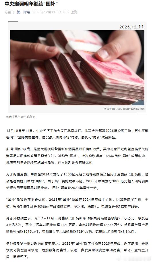 明年国补将继续!中央经济工作会议明确 2026 年优化“两新”政策实施今年国补拉动超 2.5 万亿消费,其中,汽车以旧换新超 1120 万辆;但明年新能源车购置税要从全免变减半,今年车企都在推出购置税兜底,那明年这事会成常态吗?还是说大家都先观望观望,等着看后续有没有更多优惠?中央定调明年继续国补新能源汽车