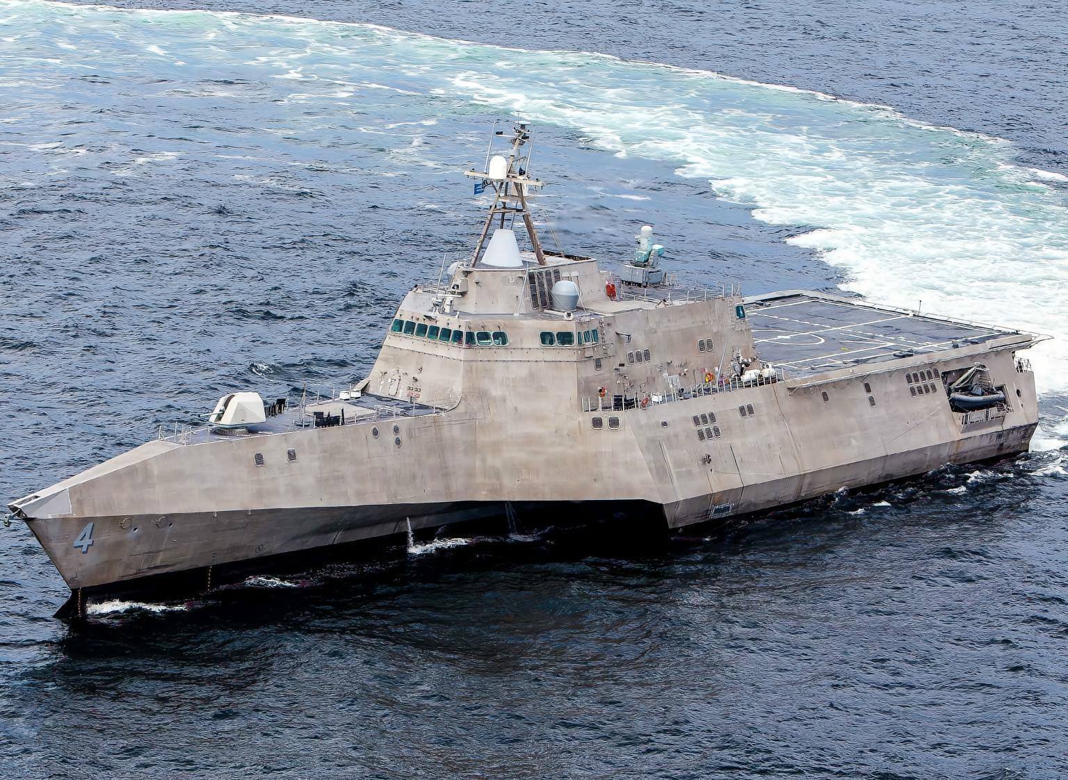 美国“独立”级濒海战斗舰“独立”级濒海战斗舰是与“自由”级同期研制的另一种濒海战斗舰,计划建造12艘,截至2016年2月已有3艘开始服役。“独立”级濒海战斗舰的舰载传感器、作战系统和指挥系统等设计突破了传统观念,能根据任务需要灵活组装、搭配不同的武器模块系统。武器装备:1门57毫米Mk 110舰炮、1套“拉姆”反舰导弹防御系统、 4挺12.7毫米机枪。动力装置:2具LM2500燃气轮机、2具MTU 20V柴油发动机。1991年苏联的解体使美国海军的作战环境、作战对象发生了巨大变化。海湾战争结束后,美国海军便开始不断地调整军事战略,先后提出了“由海向陆”“前沿存在”等新的战略思想。2002年,美国海军又提出了“海上打击”、“海上盾牌”和“海上基地”概念,标志着“近海战略”正式替代了“远洋战略”。此后,美国海军逐渐缩减大型战舰的规模,而将舰艇发展的重点转向以濒海战斗舰为代表的小型战舰。“独立”级濒海战斗舰的首舰于2006年1月开始建造,2010年1月正式服役。截至2016年2月,“独立”级濒海战斗舰已有3艘服役,另有3艘下水、2艘在建。“独立”级濒海战斗舰是一种铝质三体舰,舰体采用模块化结构,并选用先进的舰体材料和动力装置。该舰配备有舰尾舱门和一个吊臂,可以发送和回收小艇和水中传感器。此外,“独立”级濒海战斗舰还配备有升降机,可让MQ-8B无人机配置到飞行甲板下的任务舱内。“独立”级濒海战斗舰装备了1门57毫米Mk 110舰炮、1套“拉姆”反舰导弹防御系统,以及4挺12.7毫米机枪。此外,还可以加装AGM-114L“地狱火”导弹发射装置和30毫米Mk 44舰炮。该舰飞行甲板可以容纳2架SH-60直升机或者1架CH-53直升机。机库可容纳2架SH-60直升机,或者1架SH-60直升机和3架MQ-8B无人机。|