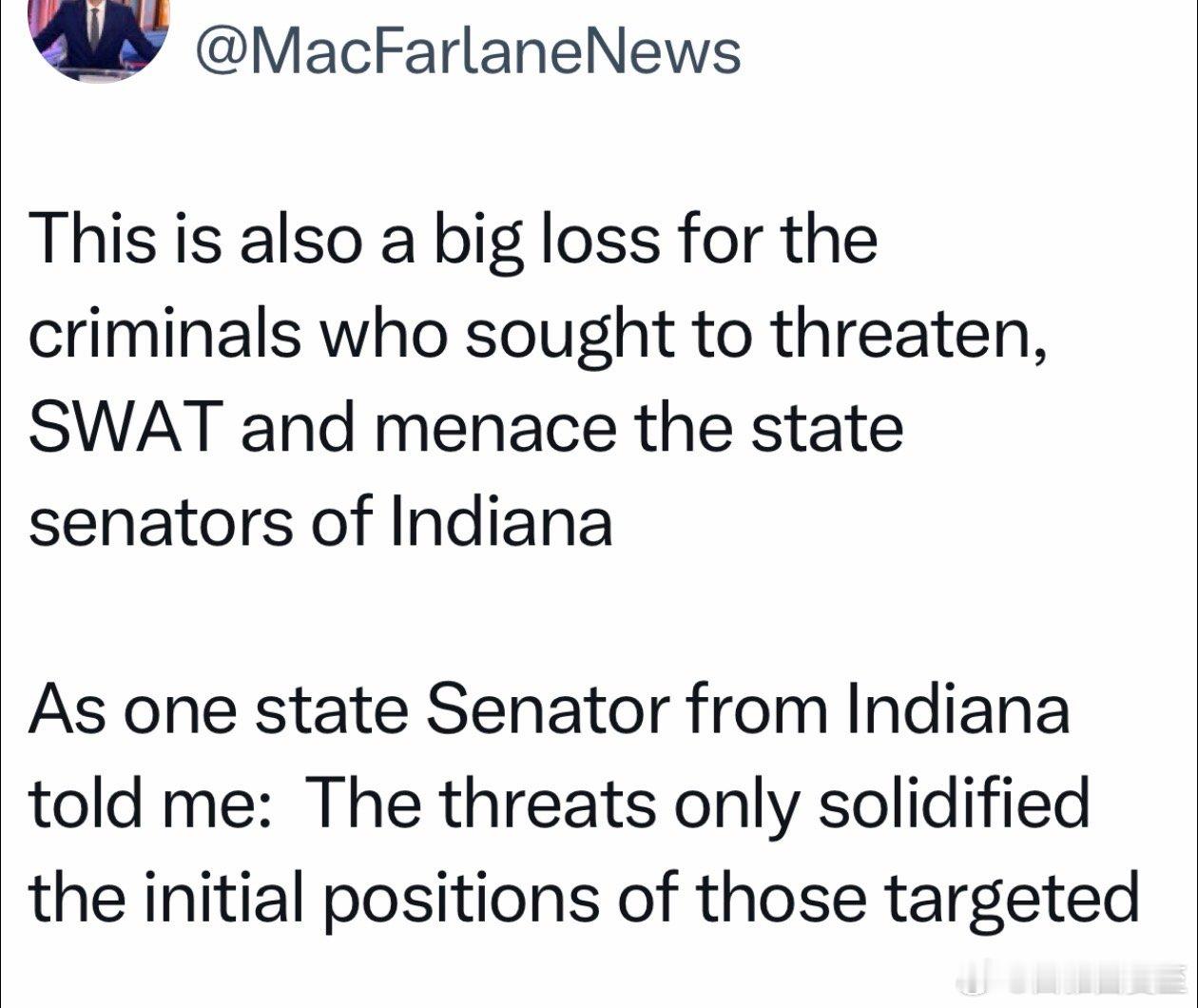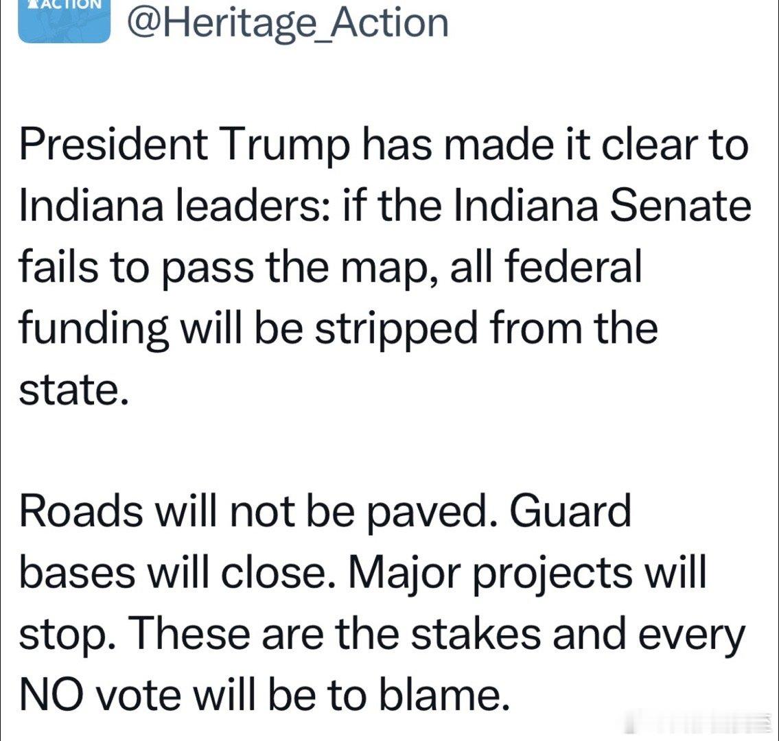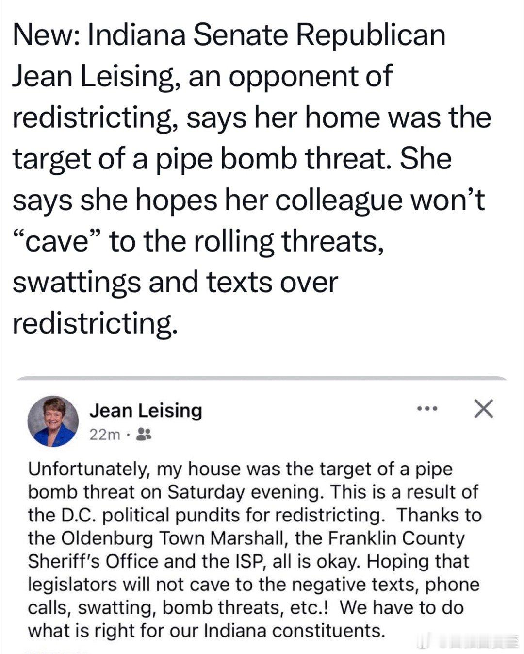 媒体报道:印第安纳州议会(共和党占80%),拒绝重划选区图,总统的施压起了巨大反作用本来有望通过,但被总统“点名批评”的议员收到死亡威胁(包括在家里安炸弹)、右翼组织“提醒”总统的承诺“不通过就不给联邦拨款”等等,促使犹豫的议员最终反对改图最近一系列的选举结果,也起到一定程度推动作用