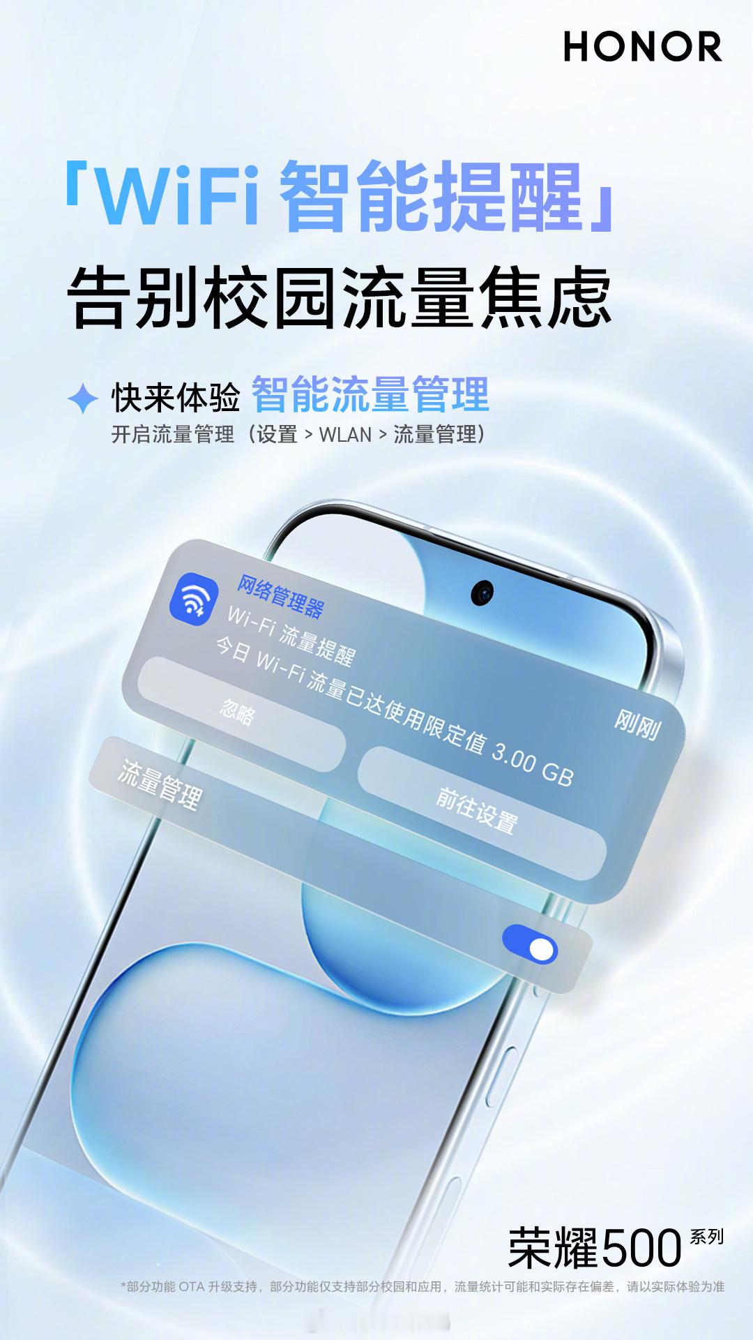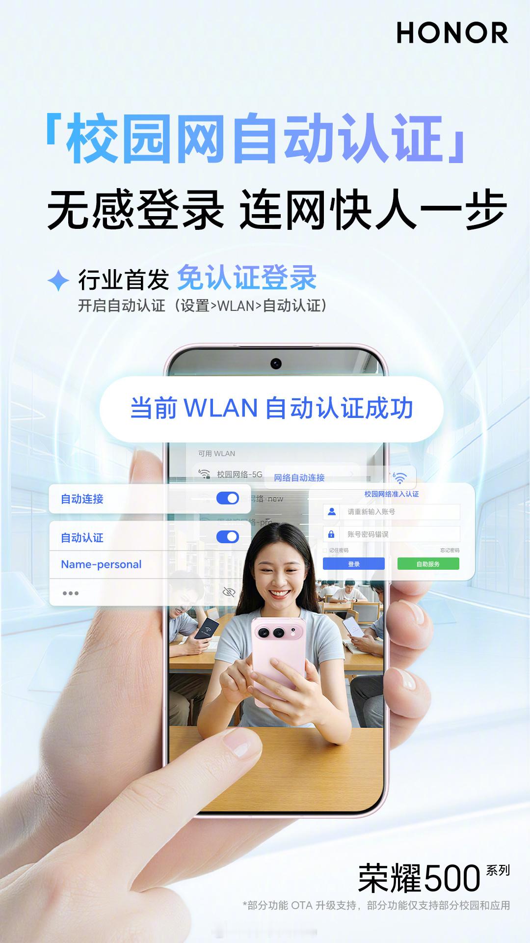 针对大学生在校用网用电痛点,荣耀500系列首发五大校园网专项优化:国内100+校园实地信号扫盲;精准预测宿舍断电断网情况,提前切换网络;首发支持校园网自动认证登录;主动提醒校园网剩余流量;一键专线加速功能,助力抢课抢票成功。荣耀MagicOSMagicOS月月新MagicOS10
