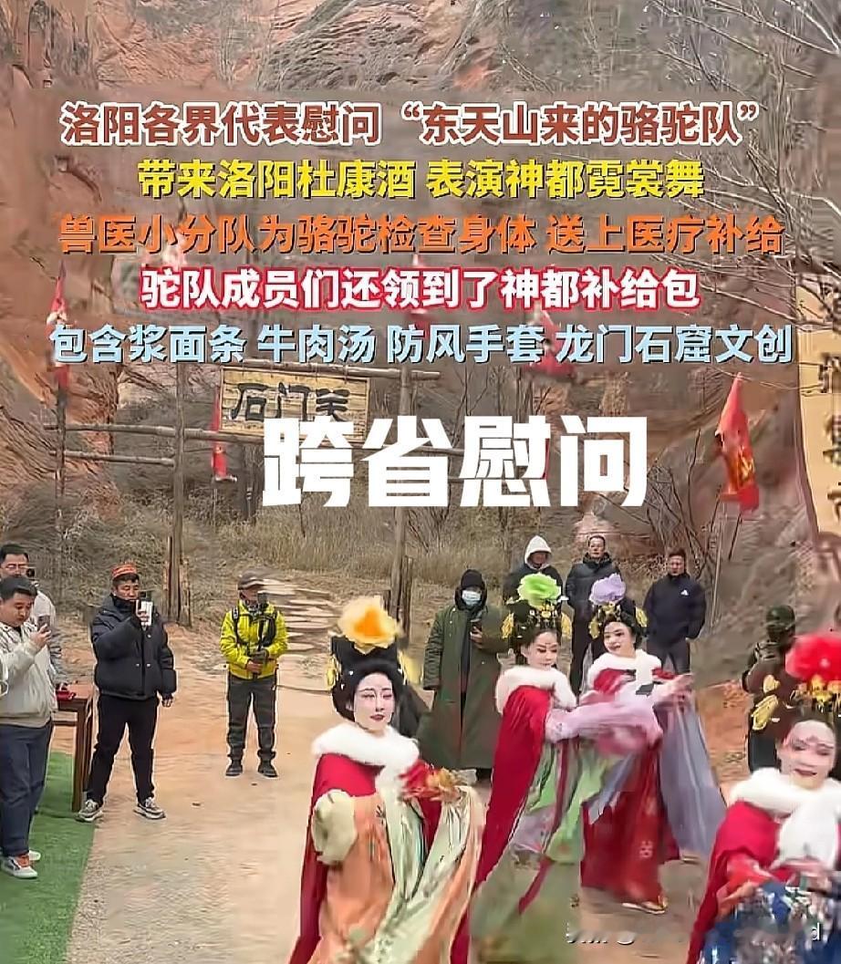 东山驼队一路走来, 尽显西北人民的真挚与淳朴, 虽然没有像河南一样跨省慰问。 但这份真诚与祝愿, 尽在厚重的民风之中。 而河南也显示出了那股热情。 一个是没有跨地域的慰问与迎接, 低调真挚而淳朴。 一个是跨地域慰问与迎接, 高调而热情。 不同的表达方式, 让东山驼队赢麻了。