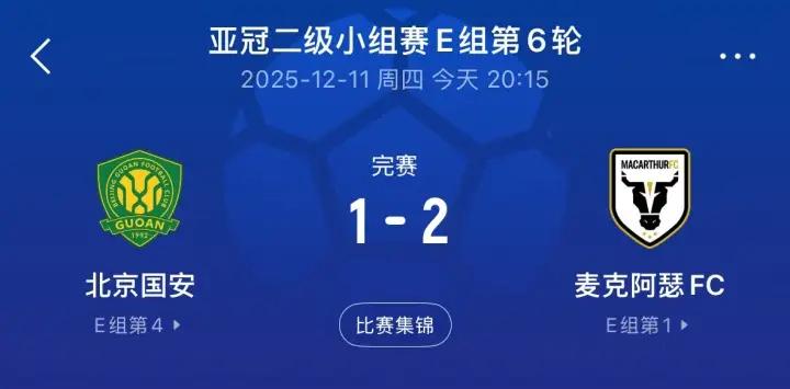 北京国安亚冠关门黑,没想到北京国安在主场1比2不敌麦克阿瑟FC,刚刚拿下中国足协杯的北京国安荣誉之战再次与输球告终,国安亚冠二级联赛小组垫底出局!国安仅拿1胜2平积5分垫底出局,北京国安是一档球队里唯一没有出线的球队,这个结果真的是没有想到。 中国中超冠军上海海港亚冠精英赛未得一胜,小组垫底出局,中国足协杯冠军也是小组垫底出局,这让中国足球情何以堪!中国足球真的应该总结经验教训了,明年亚冠还是上海海港和北京国安参加,希望两队能知耻而后勇,为中国球队挽回一点颜面。