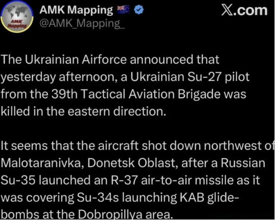 俄罗斯空天军的一架苏-35战斗机在为苏-34护航时,在顿涅茨克上空发射了一枚R-37远程空空导弹,击落了一架乌克兰空军的苏-27S战斗机,乌军飞行员伊万诺夫中校阵亡。 12月10日前后,顿涅茨克上空的一场空战让乌克兰空军又添新伤,俄军一架苏-35在掩护苏-34执行轰炸任务时,用一枚R-37远程导弹,干脆利落地击落了乌军的苏-27S,驾驶这架战机的伊万诺夫中校当场阵亡。 伊万诺夫不是新手,他是第39战术航空旅的老手,带过不少年轻飞行员,这种王牌的损失没法轻易补上,而且乌克兰的苏-27机队本来就只剩个位数,打一架少一架,现在雷达和导弹还比俄军落后两代,空中对抗根本不占优。 消息传回来后,前线不少乌军都觉得憋屈,毕竟这是战友用命拼出来的制空权争夺。 这个仇乌克兰肯定是会报的,但乌军现在手里的牌不多,空军主力得省着用,大概率会用无人机偷袭俄军机场,或者用导弹打前线弹药库,就像之前的“蛛网”行动那样,毕竟真要派战机硬碰硬,只会再吃亏,泽连斯基得先稳住西方援助,再慢慢找机会。 说真的,每次看到这种消息都挺难受,伊万诺夫的家人可能还在等他回家,可他再也回不去了,这架苏-27被击落也透着无奈——乌军飞行员明知装备不如人,还是得硬着头皮上,因为身后就是家园。 R-37导弹6马赫的速度根本不给反应时间,就像乌军飞行员说的,有时候连预警都没有就得直面坠落。 战争打到这份上,没有真正的赢家,俄军靠装备优势占了便宜,但也换不来彻底的安宁;乌军丢了战机和英雄,可守土的决心反而更坚定,只希望这种蓝天之上的厮杀能早点结束,别再让更多家庭失去亲人。 以上是小编个人看法,如果您也认同,麻烦点赞支持!有更好的见解也欢迎在评论区留言,方便大家一同探讨。[赞]