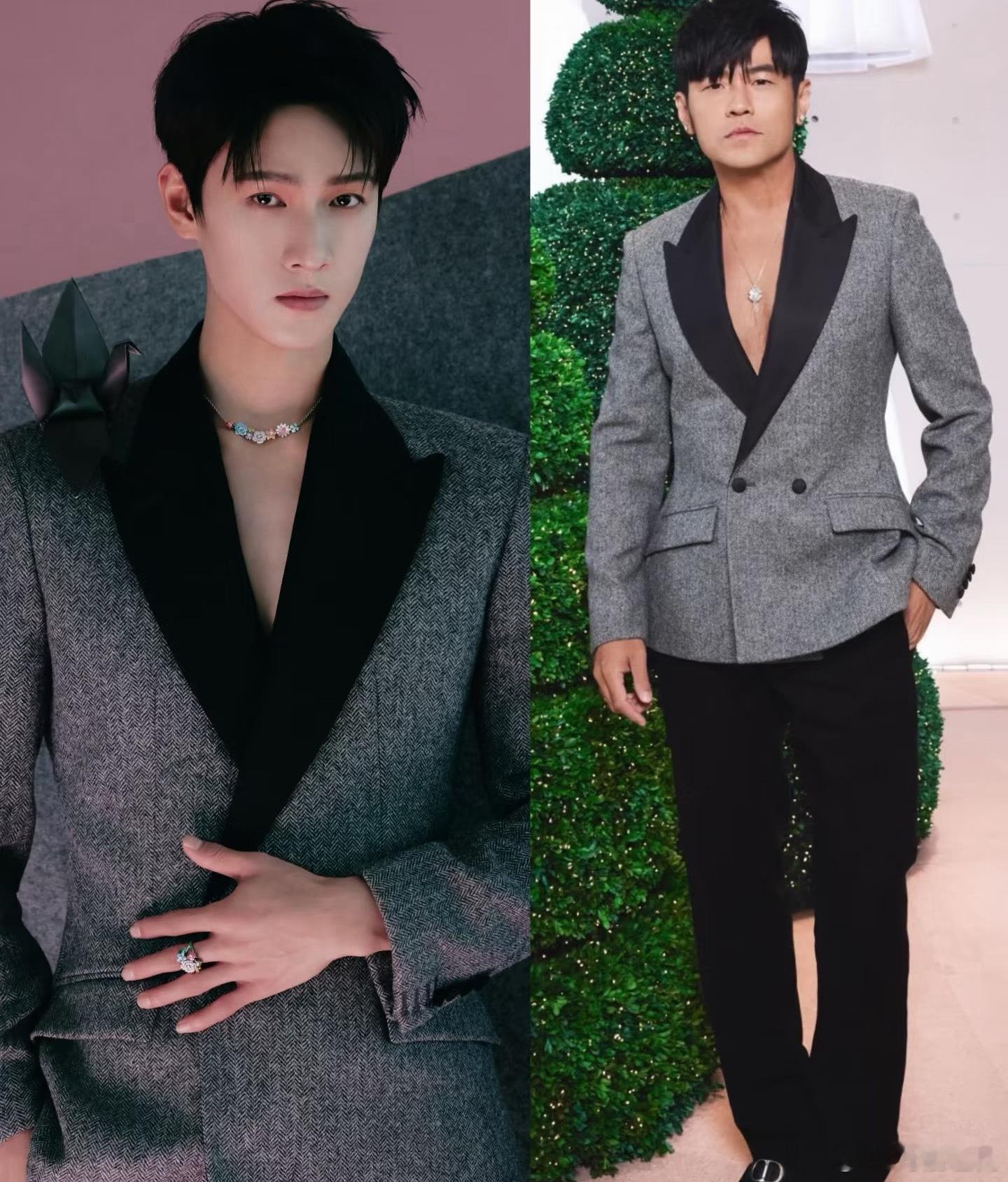 李昀锐周杰伦穿了同款灰色拼接丝绒西装,一个是自带松弛感的乐坛王者,一个是少年感拉满的贵气型男!