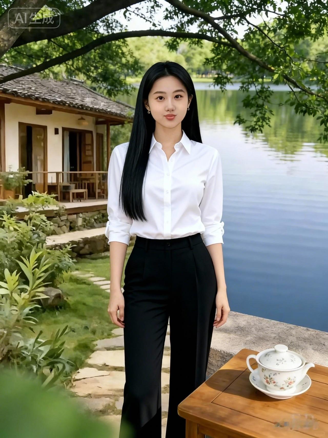 在湖畔的静谧时光,白衬衫与黑裤子的优雅搭配,尽显都市女性的时尚与自信。