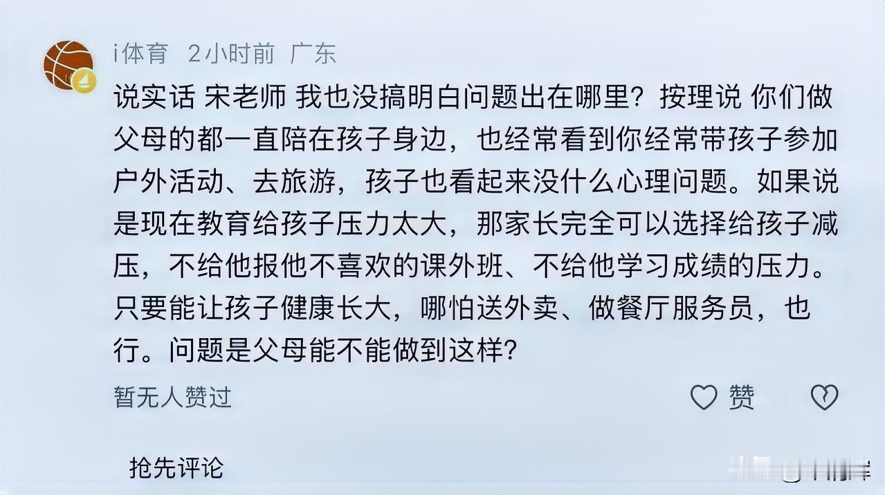 一位广东网友的留言:“说实话 宋老师 我也没搞明白问题出在哪里?按理说 你们做父母的都一直陪在孩子身边,也经常看到你经常带孩子参加户外活动、去旅游,孩子也看起来没什么心理问题。如果说是现在教育给孩子压力太大,那家长完全可以选择给孩子减压,不给他报他不喜欢的课外班、不给他学习成绩的压力。只要能让孩子健康长大,哪怕送外卖、做餐厅服务员,也行。问题是父母能不能做到这样?”