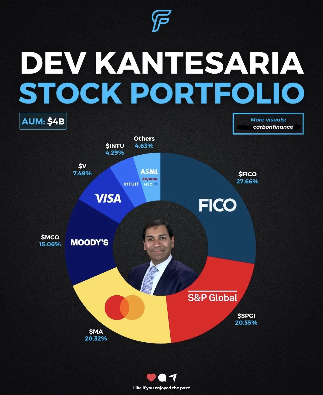 📊 图中展示了知名基金经理 Dev Kantesaria 管理的 40 亿美元资产组合。