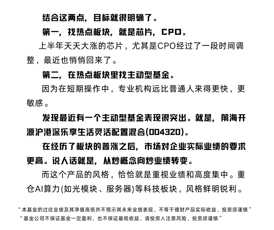 而这个产品的风格,恰恰就是重视业绩和高度集中。重仓AI算力(如光模块、服务器)等科技板块,风格鲜明锐利。