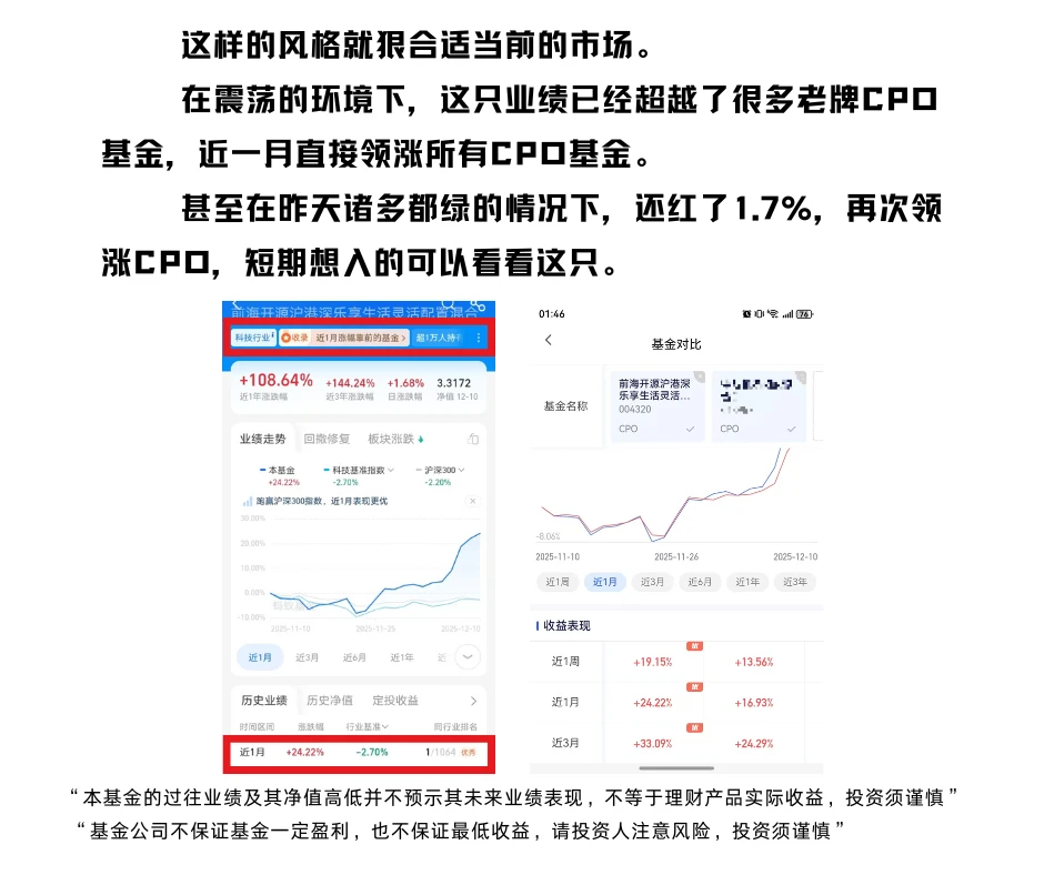 在震荡的环境下,这只业绩已经超越了很多老牌CPO基金,近一月直接领涨所有CPO基金。甚至在昨天诸多都绿的情况下,还红了1.7%,再次领涨CPO,短期想入的可以看看这只。