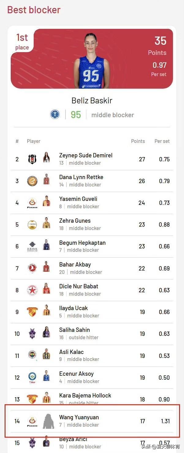 东方神秘女子王媛媛三场比赛拦网17分,已经来到土超拦网榜的第14位,甚至是连头像都还没的无名女士,局均拦网是1.31分排名第一位,土超联赛后半段才转会进去的啊,媛媛,请照着这个拦网速度继续拦下去,我们迟到会进拦网榜前三位的,相信你的实力!感觉加拉塔萨雷女排俱乐部还会跟王媛媛再续约一个赛季!