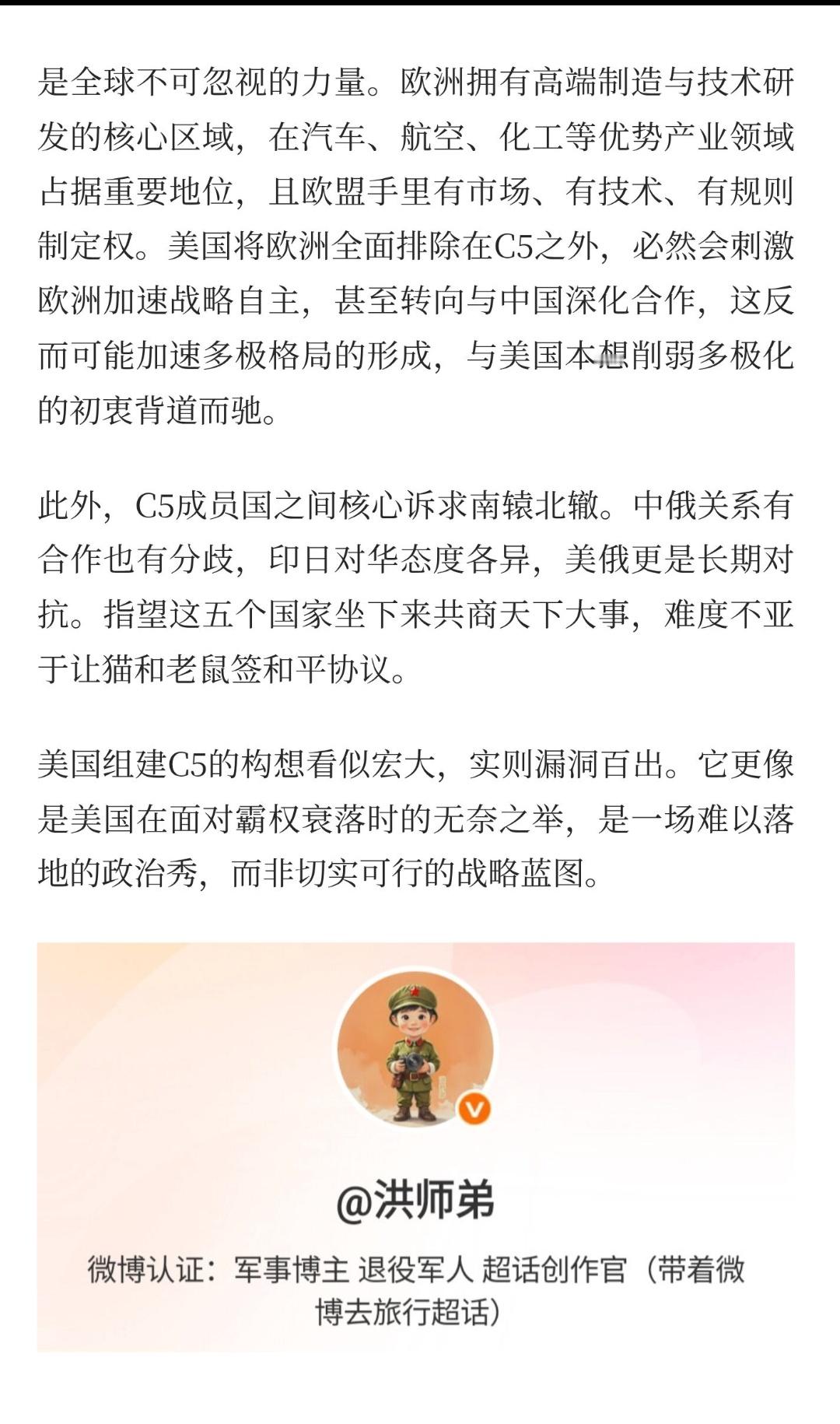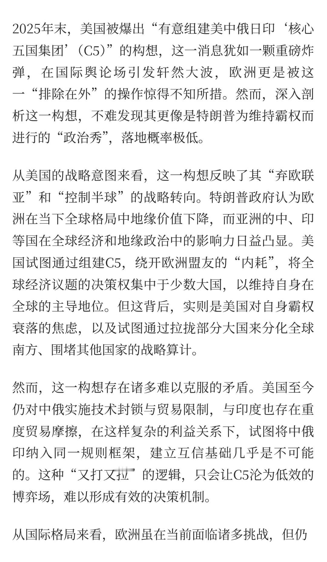 | 2025年末,美国被爆出“有意组建美中俄日印‘核心五国集团’(C5)”的构想,这一消息犹如一颗重磅炸弹,在国际舆论场引发轩然大波,欧洲更是被这一“排除在外”的操作惊得不知所措。然而,深入剖析这一构想,不难发现其更像是特朗普为维持霸权而进行的“政治秀”,落地概率极低。特朗普政府认为欧洲在当下全球格局中地缘价值下降,而亚洲的中、印等国在全球经济和地缘政治中的影响力日益凸显。美国试图通过组建C5,绕开欧洲盟友的“内耗”,将全球经济议题的决策权集中于少数大国,以维持自身在全球的主导地位。但这背后,实则是美国对自身霸权衰落的焦虑,以及试图通过拉拢部分大国来分化全球南方、围堵其他国家的战略算计。美国至今仍对中俄实施技术封锁与贸易限制,与印度也存在重度贸易摩擦,在这样复杂的利益关系下,试图将中俄印纳入同一规则框架,建立互信基础几乎是不可能的。这种“又打又拉”的逻辑,只会让C5沦为低效的博弈场,难以形成有效的决策机制。欧洲拥有高端制造与技术研发的核心区域,在汽车、航空、化工等优势产业领域占据重要地位,且欧盟手里有市场、有技术、有规则制定权。美国将欧洲全面排除在C5之外,必然会刺激欧洲加速战略自主,甚至转向与中国深化合作,这反而可能加速多极格局的形成,与美国本想削弱多极化的初衷背道而驰。中俄关系有合作也有分歧,印日对华态度各异,美俄更是长期对抗。指望这五个国家坐下来共商天下大事,难度不亚于让猫和老鼠签和平协议。美国组建C5的构想看似宏大,实则漏洞百出。它更像是美国在面对霸权衰落时的无奈之举,是一场难以落地的政治秀,而非切实可行的战略蓝图。