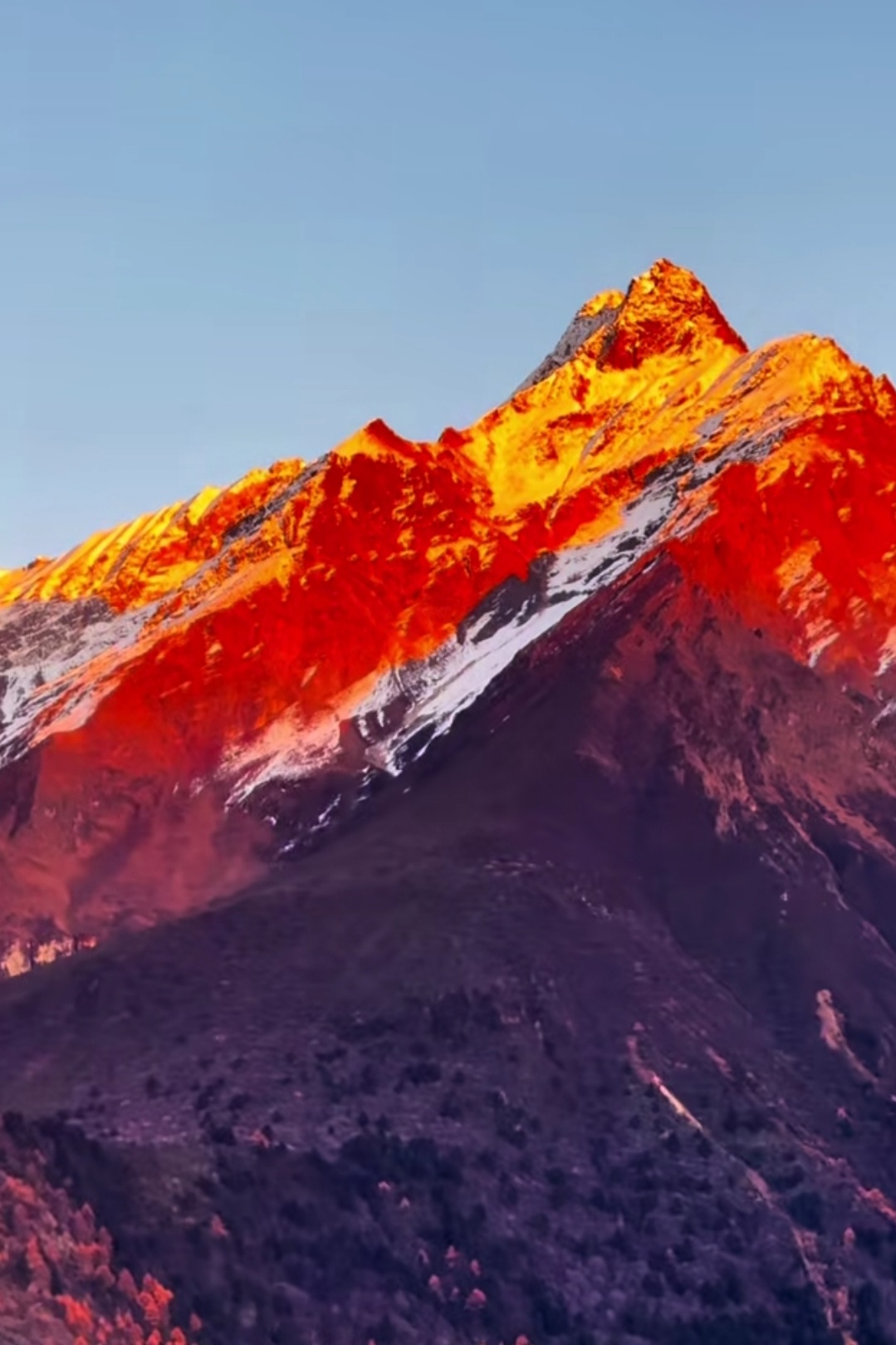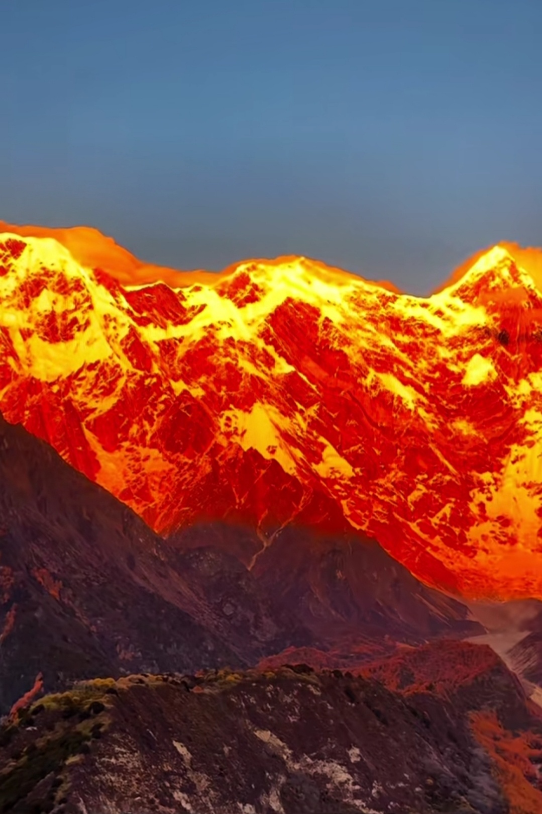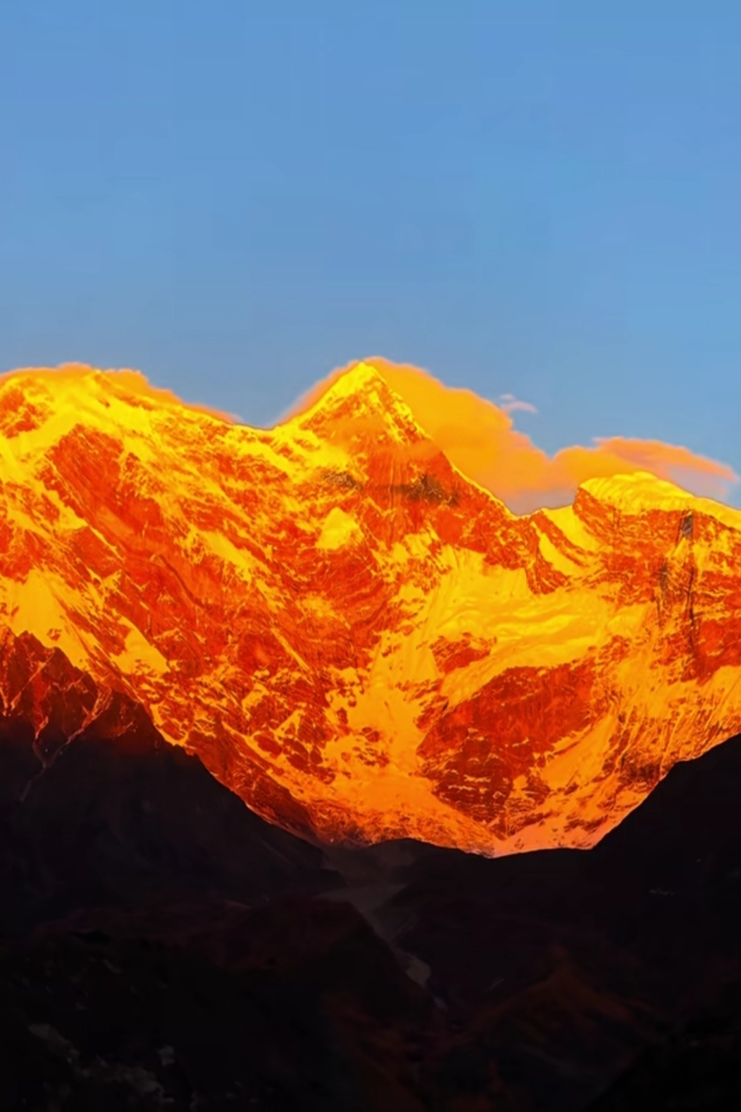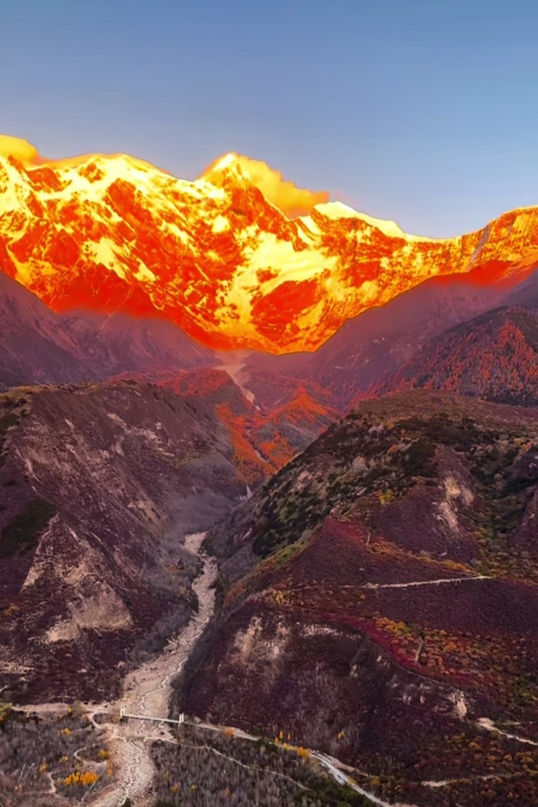 🏔️ 当清晨第一缕光吻上南迦巴瓦,雪山瞬间被点燃成金色。 那是属于神山的加冕时刻,一半热烈,一半沉静。天蓝得如此纯粹,山峦披上金纱,云霞也染上羞赧的橙。有人说,看见日照金山的人会幸运一整年,而这一刻,我只想屏住呼吸,把所有的震撼和感动,都揉进这幅天赐的画面里。南迦巴瓦,十人九不遇的“羞女峰”,谢谢你为我露出真颜。这世界有多少风景值得跋涉?答案,就藏在这片金色的光芒中。