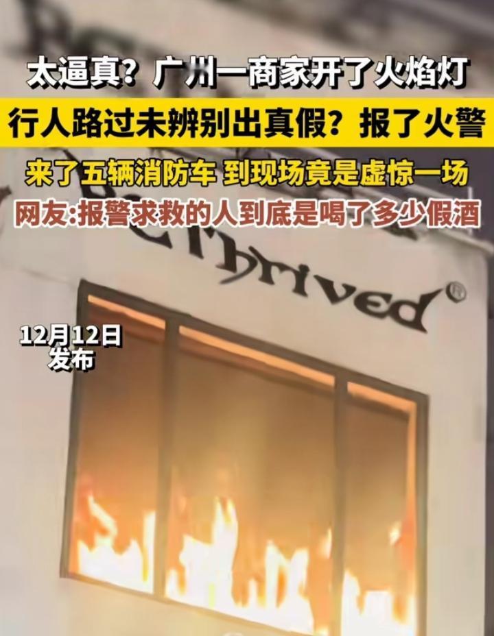 不得了啦!广州街头近日上演超乌龙一幕。有商家为增添独特氛围,开启了火焰灯。那火焰摇曳之态栩栩如生、惟妙惟肖,路过行人竟完全无法辨别其真伪。 行人以为是真起火,赶忙拨打火警电话。警方迅速调配五辆消防车风驰电掣般赶赴现场。消防员们严阵以待,准备与大火一决高下。 可到了现场才发现,这一切都是那逼真火焰灯惹的祸,纯粹是虚惊一场。不得不说这火焰灯的逼真程度实在让人惊叹!