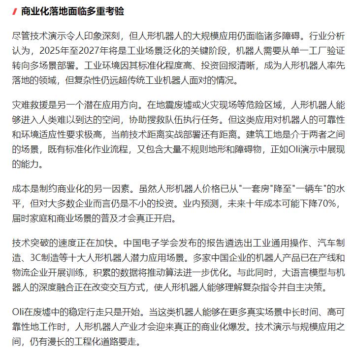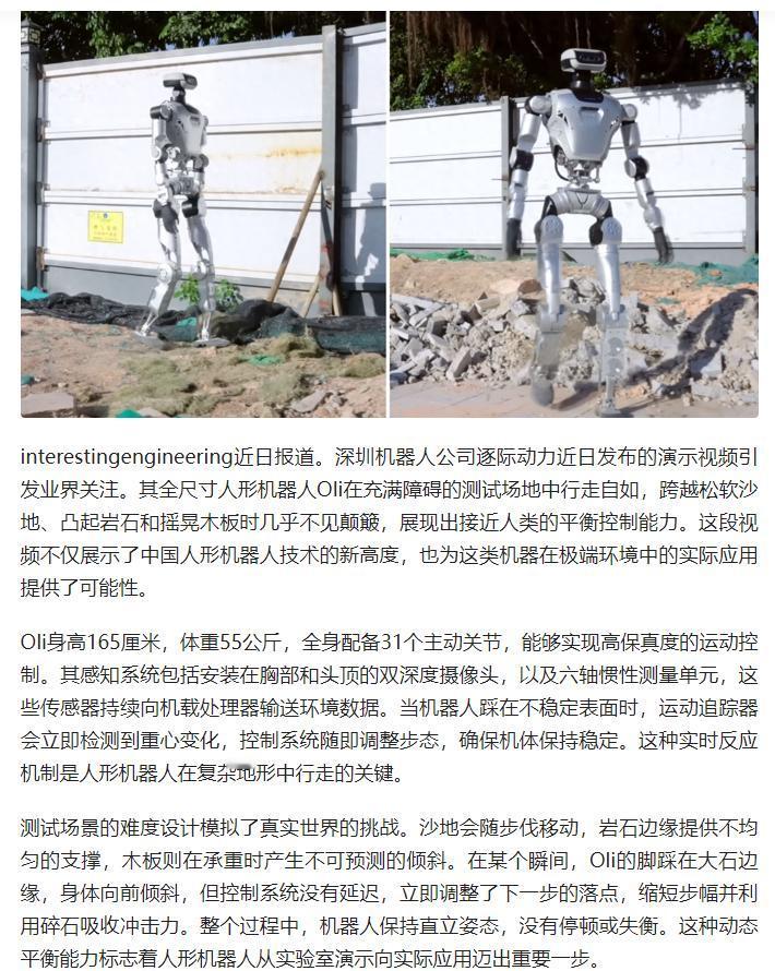 深圳机器人公司逐际动力近日发布的演示视频引发业界关注。其全尺寸人形机器人Oli在充满障碍的测试场地中行走自如,跨越松软沙地、凸起岩石和摇晃木板时几乎不见颠簸,展现出接近人类的平衡控制能力。这段视频不仅展示了中国人形机器人技术的新高度,也为这类机器在极端环境中的实际应用提供了可能性。 原文来自:人工智能学家《外媒:中国的人形机器人以类似人类的平衡能力在废墟中行走》