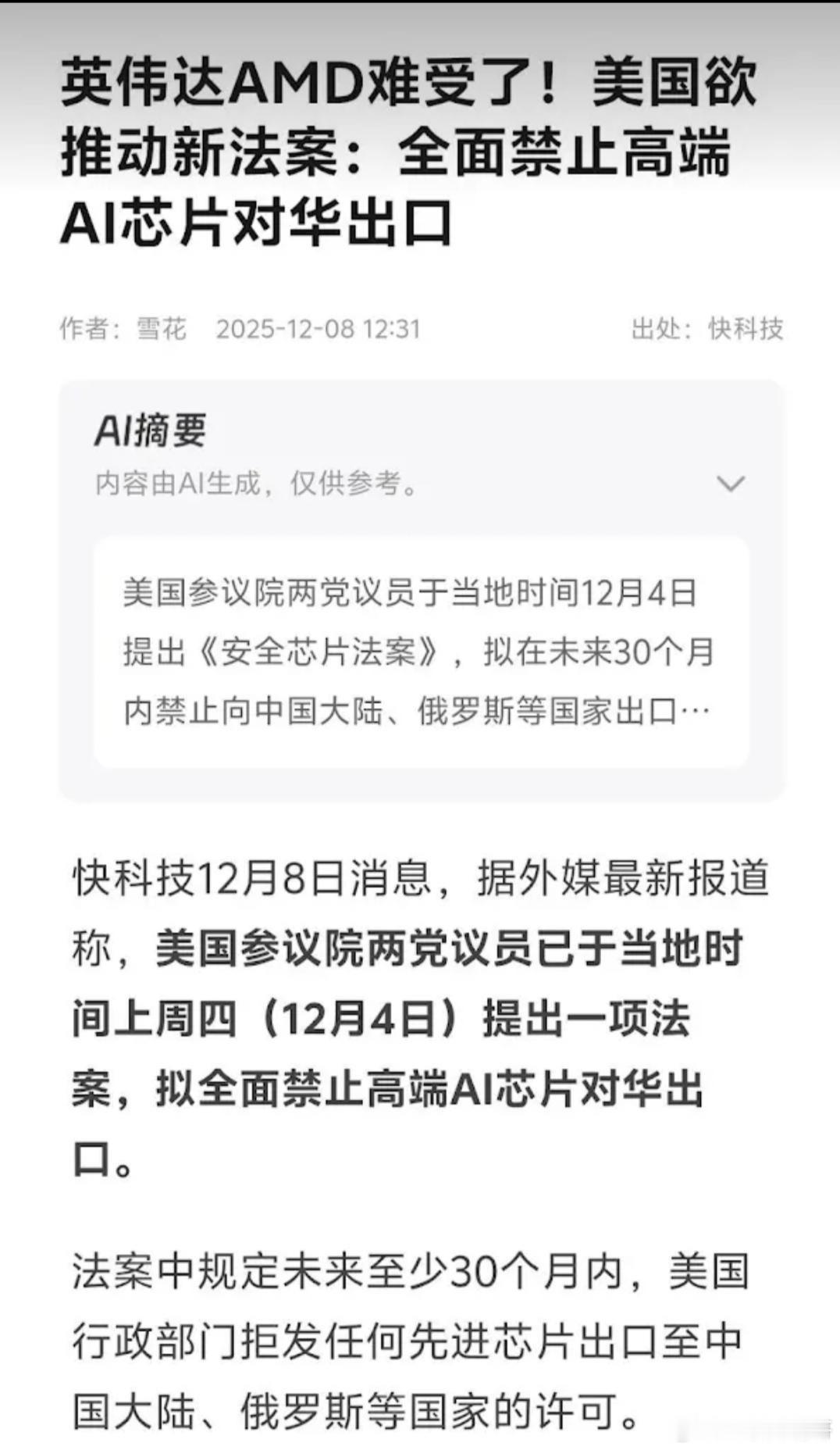 差点要被黄仁勋笑死,刚说好英伟达可以卖H200给中国,中国还没表态要不要,大美丽两党议员联手提出了新的《芯片安全法案》,规定未来2年半的时间里,禁止任何高端AI芯片出口至中俄伊等国。老黄算是空高兴一场!从当前看是坏事,但从长远看,国家加大芯片领域研发投入,强化国产替代战略,从而缩小芯片领域同国际先进水平的差距,最后彻底摆脱对外国的依赖,这又是一件好事!他禁芯片并不是要封锁芯片技术,他也知道芯片技术封锁不住。他是要限制AI技术发展,能拖慢你AI发展节奏一点是一点。虽然也不是什么高招,但也没有蠢到毫无逻辑。提出法案到讨论到投票,再到特朗普签署生效,这个过程怎么也得几个月,能不能通过还不一定呢。