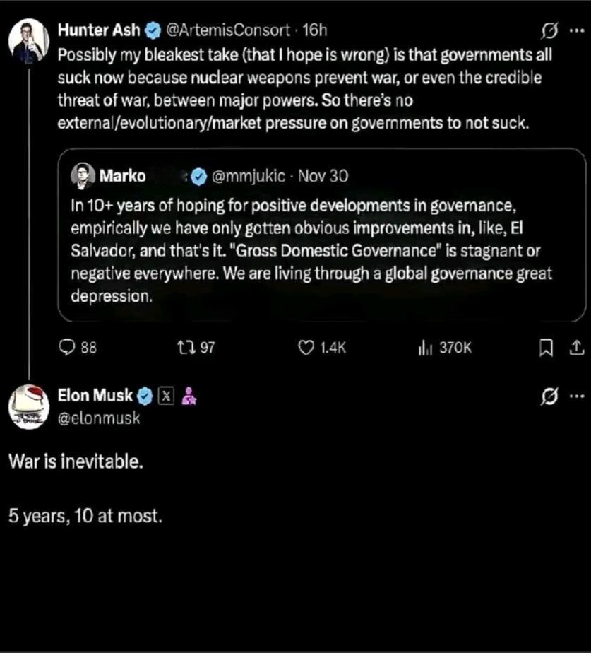 马斯克凌晨3点不睡觉, 直接给全世界泼了一盆凉水。 2025年12月1日凌晨三点,马斯克在X平台敲下一行字:“未来5到10年,战争几乎不可避免。” 这个裹挟着全球焦虑的断言,像一盆冰水泼醒了深夜的互联网。 此刻距他担任特朗普政府效率部长卸任仅月余,距SpaceX拿到美国防部47亿美元订单不足半年,距白宫新版国家安全战略8次提及台湾省仅四天——时间线的巧合,让这场“预言”更像是精心设计的舆论炸弹。 马斯克将“全球债务310万亿”与“生育率跌破2.1”列为战争推手,数据是冰冷的:美国国债34万亿,利息支出明年将超过军费;韩国生育率0.72,日本自卫队征兵完成率76%。 但历史账本上,1980年至今124次债务危机,仅3次演变为战争。 1998年韩国外债率80%,靠产业转型而非枪炮渡劫;2010年希腊债务违约,欧盟用救助协议稳住了火药桶。 债务危机更常见的出路,是财政紧缩、债务重组,或是像日本那样用30年消化政府债务率264%的压力。 生育率下降与战争的关联同样脆弱,少子化直接削弱战争潜力:韩国20-30岁人口十年减少40%,不得不缩短兵役期;德国2024年接纳32万移民填补劳动力。 真正让决策者心动的,是马斯克没明说的变量——技术。俄乌战场证明,1200万美元的无人机蜂群,能瘫痪30亿美元的军舰。 当战争成本从“拼人头”变成“拼算法”,某些势力会误以为“有限冲突”可控——这正是美国新国安战略的核心逻辑:用星链卫星+AI无人机,打一场零美军伤亡的代理人战争。 SpaceX的军事订单在2024年暴涨62%,星链系统在乌克兰的实战表现,让五角大楼看到“低成本霸权”的可能。 马斯克的预言,恰为这种新战争模式铺路——当舆论接受“战争不可避免”,各国就会加大对卫星通信、AI武器的投入。 他旗下的星盾计划、xAI公司,正是这套体系的核心拼图,就像2024年星链通过俄乌冲突赚走15亿美元,未来的“预言成真”,可能成为SpaceX的财富密码。 更隐秘的是美国的战略转向,特朗普政府的国安文件8次提及台湾,却删掉“反对”改为“不支持”单方面改变现状——这种模糊措辞,既挑逗“台独”势力冒险,又为美国保留“不出兵”的退路。 兰德公司推演显示,2027年前台海冲突概率42%,而美国的预案是:让日本、澳大利亚当炮灰,自己遥控无人机参战。 马斯克的“预言”,本质是为这套“风险转嫁”剧本造势——用科技光环包装战争,让普通人觉得“打起来也死不了几个自己人”。 但历史不是简单的危机叠加,1929年大萧条催生二战,是因为全球贸易体系崩溃、大国零和博弈。 今天的世界GDP是1930年的100倍,中美年贸易6900亿美元,中欧供应链深度绑定,德国2024年从俄罗斯进口的液化天然气虽减少60%,却从美国进口增加3倍——经济 interdependency 已成为最坚固的刹车。 联合国、WTO等机制虽不完美,却提供了1930年没有的对话平台。即便是俄乌战场,双方至今未突破“代理人战争”的阈值,正是忌惮全面冲突的毁灭性。 马斯克的凌晨警告,更像一场精准的舆论操控,他深谙:在注意力经济时代,“战争倒计时”比“治理方案”更抓眼球。 但被他忽略的是,全球债务的根源是美元霸权,生育率下滑的症结是高成本育儿,这些结构性问题需要的是国际协作,而非制造对立。 正如2024年G20峰会推动的SDR改革,虽步履维艰,却证明多边主义并未死亡。 马斯克的预言像一面魔镜:它照出了全球治理的裂痕,却也掩盖了人类的韧性,未来5到10年,战争的阴影或许挥之不去,但真正的危机,是我们是否会被“不可避免”的叙事绑架,放弃寻找和平的可能。 毕竟,当SpaceX的星链卫星在头顶闪烁,它既可以是战争的眼睛,也可以是连接对话的桥梁——选择权,从来不在预言里,而在每个决策者的一念之间。