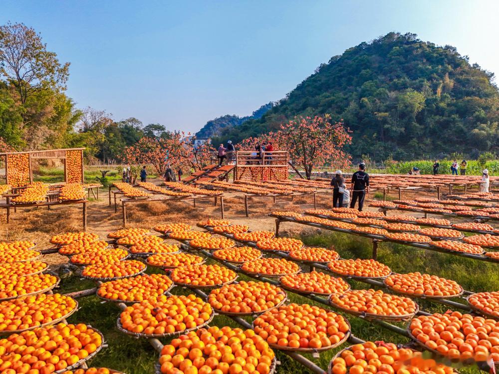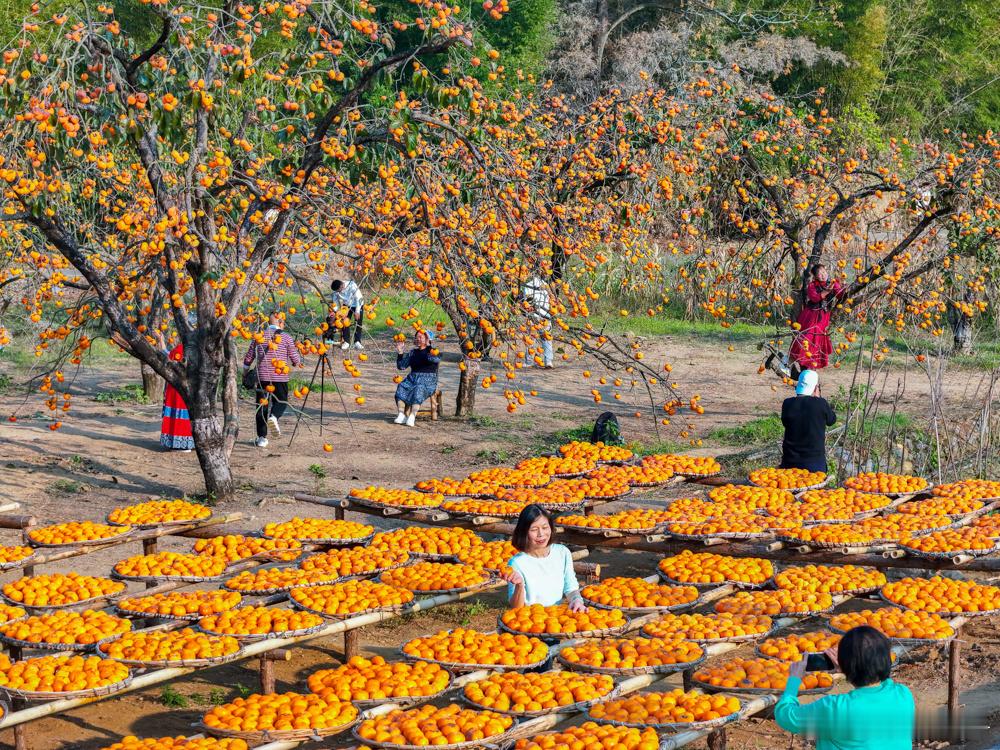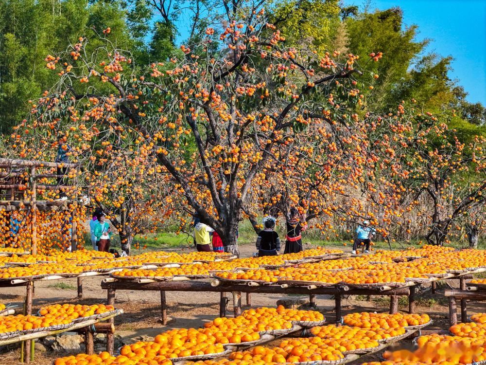 最美中国在广西桂林市恭城瑶族自治县莲花镇红岩村,游客在月柿园里游玩。(无人机照