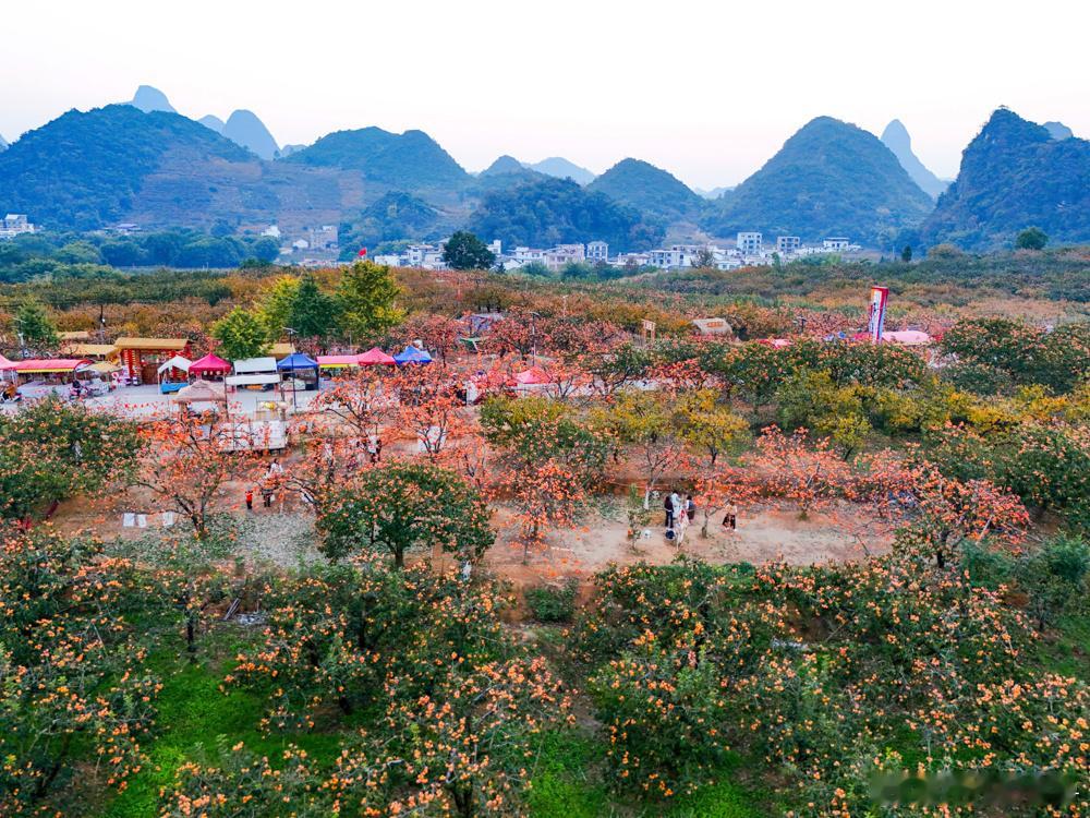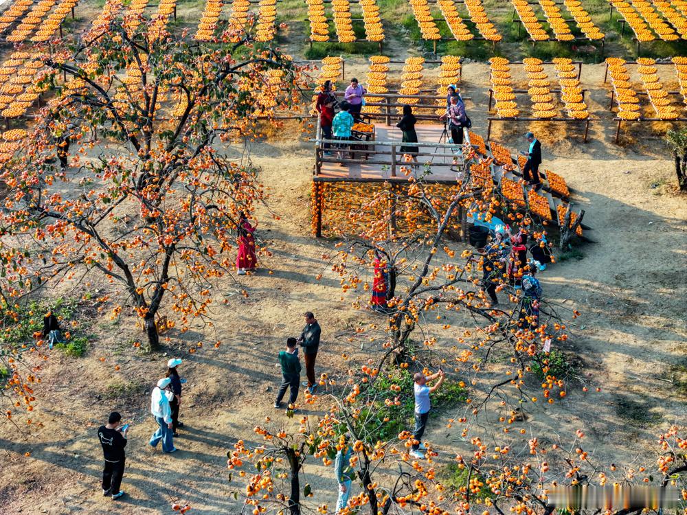 最美中国 在广西桂林市恭城瑶族自治县莲花镇红岩村,游客在月柿园里游玩。(无人机照片)CICPHOTO/黎豪图 摄