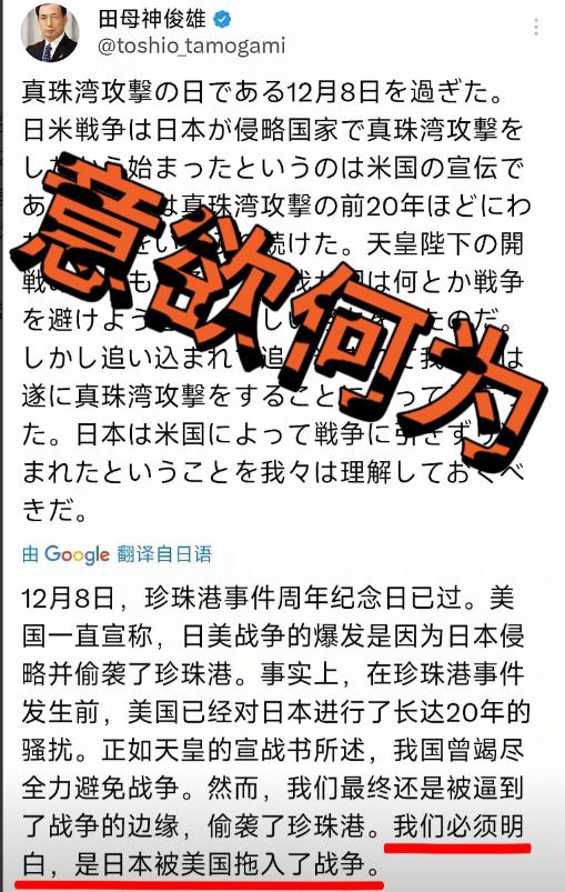 日本前将领称珍珠港事件是美国栽赃!这就是日本右翼的逻辑,我偷袭了你,是你的错,是你诬陷我! 田姆神俊雄,这货是个狂热的军国主义分子和极端反华反人类罪犯,它在日本有一定热度,只能证明日本极右翼势力猖獗,军国主义思想抬头,现在连美国都不顾及了,可见它有多狂妄,美国也该放弃地缘政治幻想了,趁它有生之年赶紧绑上绞刑架吧,别迟疑! 日本右翼的理论是只要我有理由,那我的行为就是正当的,只要你怕我,那我欺负你就是正当的,只要我想要,那我抢你的也是正当的! 在日本带这种倾向的人不是少数,而已经是大部分甚至是绝大部分了。所以我们必须提高警惕,任何时候都不能掉以轻心!