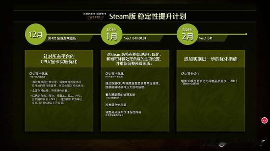 《怪物猎人:荒野》Showcase中,官方表示收到了许多玩家关于Steam版稳定性的宝贵意见,开发人员已了解相关状况,并持续推进优化与稳定性的提升。以下是Steam版稳定性提升计划: 在12月16日的第四弹免费大更新中,将针对所有平台的CPU/显卡实施优化。具体效果为优化处理时间,降低硬件负载,实施总计100项以上的改进。 在2026年1月份,将对Steam版特有的处理进行优化,新增可降低处理负载的选项设置,并重新调整预设画质。包括CPU/显卡优化,新增与调整预设画面、着色器编译的改进处理、改善显存使用量、调整高分辨率纹理包的内容等。 在2026年2月份,将追加实施进一步的优化措施,包括CPU/显卡优化、降低显卡运算压力。