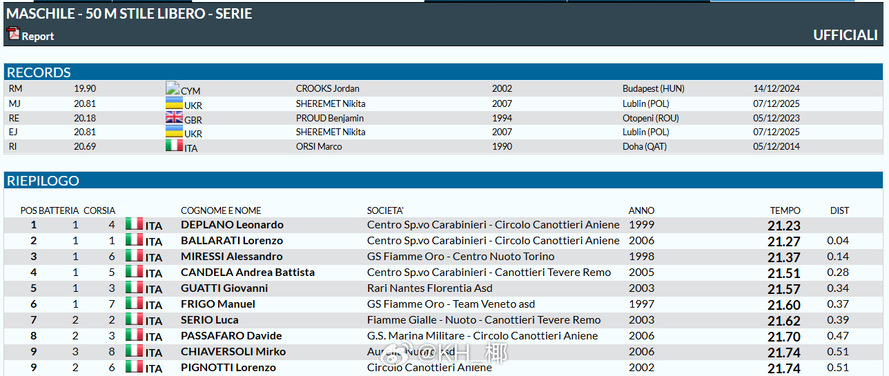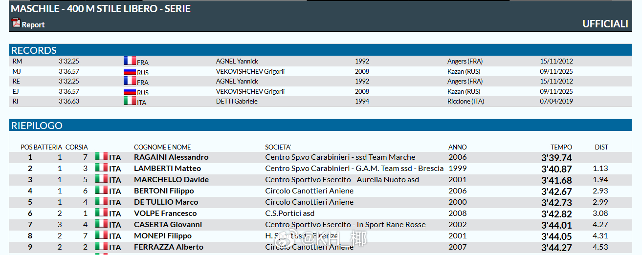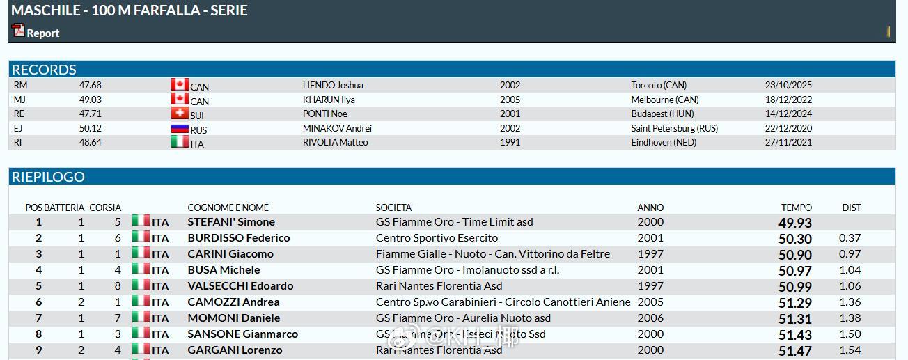 意大利短池游泳锦标赛 第一天比赛男400自:Alessandro Ragaini 3:39.74男100蝶:Simone Stefani 49.93男100自:Leonardo Deplano 21.23女100蛙:Lisa Angiolini 1:04.42