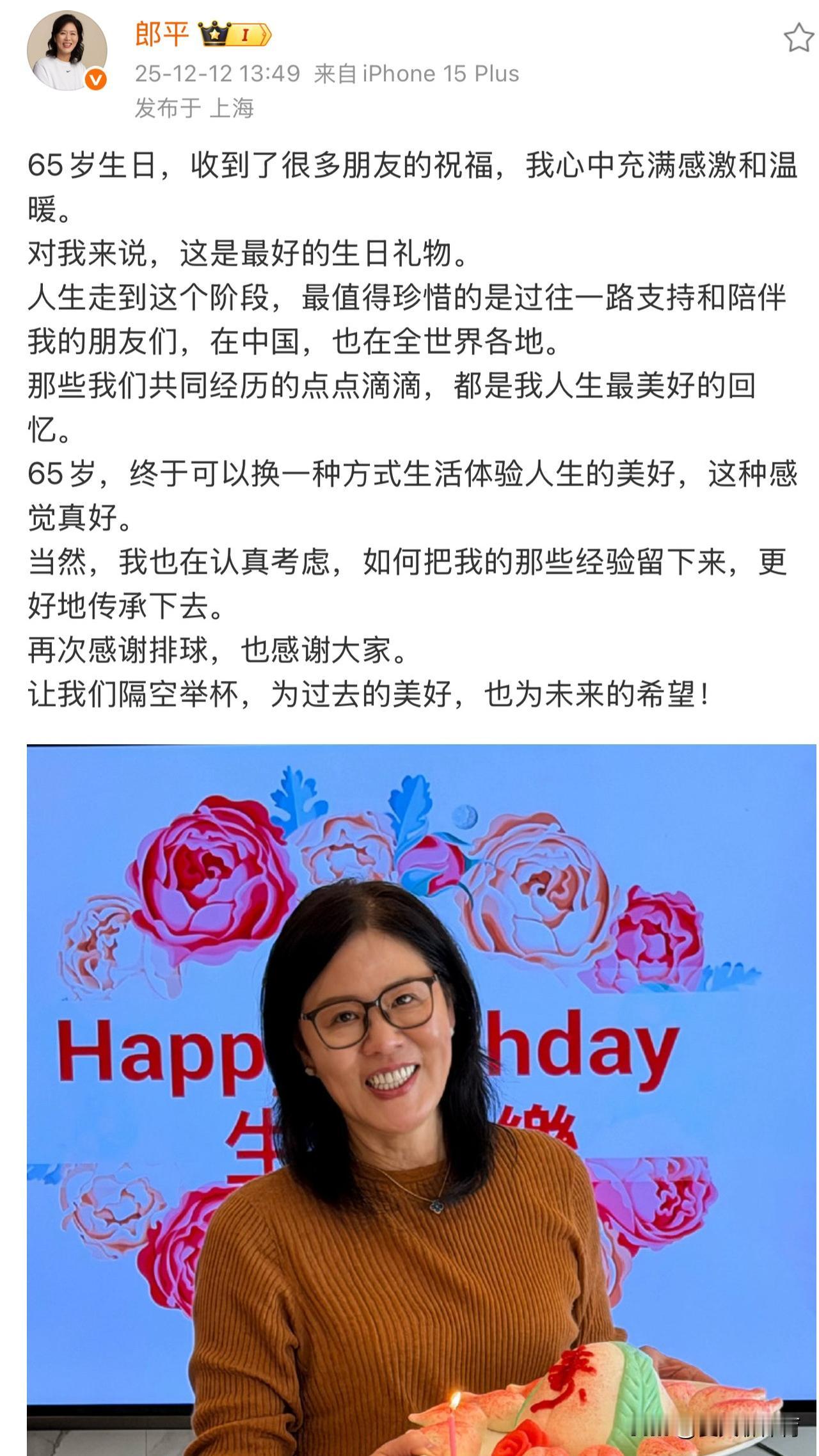 郎平教练在上海过65岁生日🎂[蛋糕][蛋糕]很喜欢郎导的这段文字,不矫揉造作,不是所谓的高级表达,但把想表达的意思说的清清楚楚,让人感觉很舒服!重点在最后,是不回再回来执教中国女排的,但是可以把自己宝贵的经验传授给女排,做好传承,她真的是一位很伟大的教练,真的很懂得感恩排球!