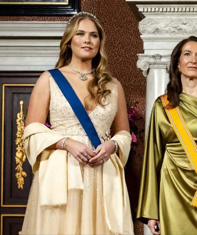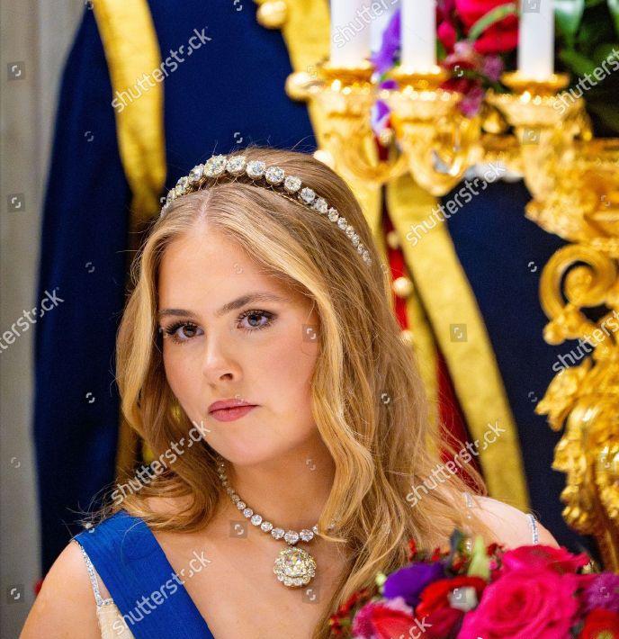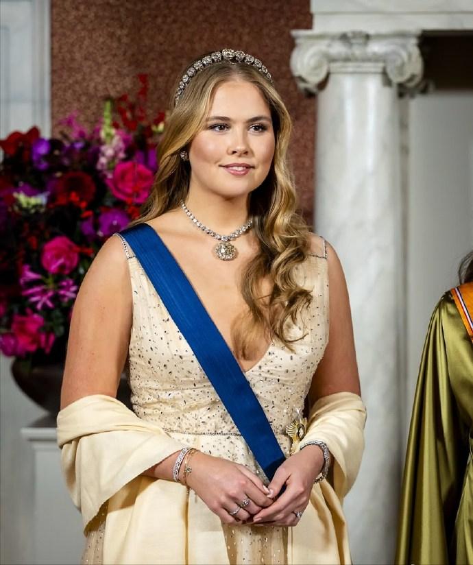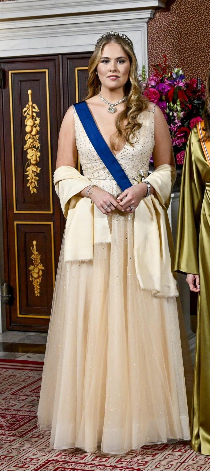 12月11日,为欢迎来访的芬兰总统亚历山大·斯图布阁下和夫人苏珊娜·英纳斯·斯图布,荷兰王室举办了隆重的欢迎晚宴。女王储阿玛丽亚惊艳亮相,全新造型可圈可点,真是太美了。 女王储凯瑟琳娜·阿玛丽亚盛装出席晚宴,这次真是把人美到了,也让我知道了什么是真正的珠圆玉润。 凯瑟琳娜·阿玛丽亚公主穿着一袭Jenny Packham的浅黄色深V吊带礼服,搭配同色披肩,丰腴的身材瘦了不少,但是180CM的大高个依旧圆润,不显得肥胖,反而雍容大气。 阿玛丽亚公主这次还新解锁钻石发带,搭配大如 冰糖的钻石吊坠,一头大波浪卷发,真正是太美了!整体造型可圈可点,尽显未来女王的风采!