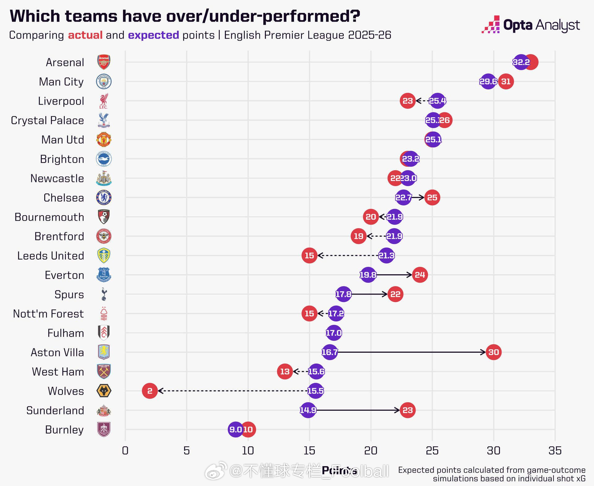 本赛季英超迄今为止各队预期积分和实际积分之差:用预期进球数据的模型来计算的话,维拉的预期积分仅仅为16.7分,但实际却拿到了30分;另一端,狼队在预期积分达到15.5分的情况下,实际积分仅有2分……英超联赛