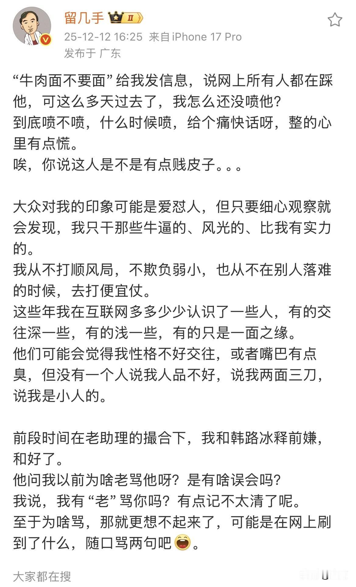 留几手: “牛肉面不要面”给我发信息了[捂脸] 就在刚才,留几手在社交网络表示,陈震私底下给他发信息了,因为他在时刻的关注着留几手,为啥这么久以来,他还没有说陈震,所以他就想问一下[捂脸] 留几手之前其实已经劝过陈震了,那个时候他还没有出事情,他就劝陈震不要大大小小逮着一个事情不放,不然会被自己的这种个性影响的。 当然那个时候,谁也不知道他税有问题,所以到现在为止留几手在网上也没有说陈震任何不好的地方,他表示自己不喜欢落井下石,更不会在人家落难的时候去占人家的便宜。 当然,他也没有透露更多的消息,不知道现在陈震有没有想清楚自己如何发展,因为根据他前两天最后的朋友圈消息来看,他是不会去国外发展了,而且也不会在社交网络表达自己了。 可能现在他只有慢慢地捱了,只是对于他而言,一个工作干了十多20年,突然就紧急刹停了,无论是思维习惯上,行动上,应该都是很不习惯的,这不仅仅只是赚钱的问题,在习惯了生活节奏之后,突然过着与自己之前几十年的生活完全不同的模式,这种东西对他的考验,应该远远大于挣钱。