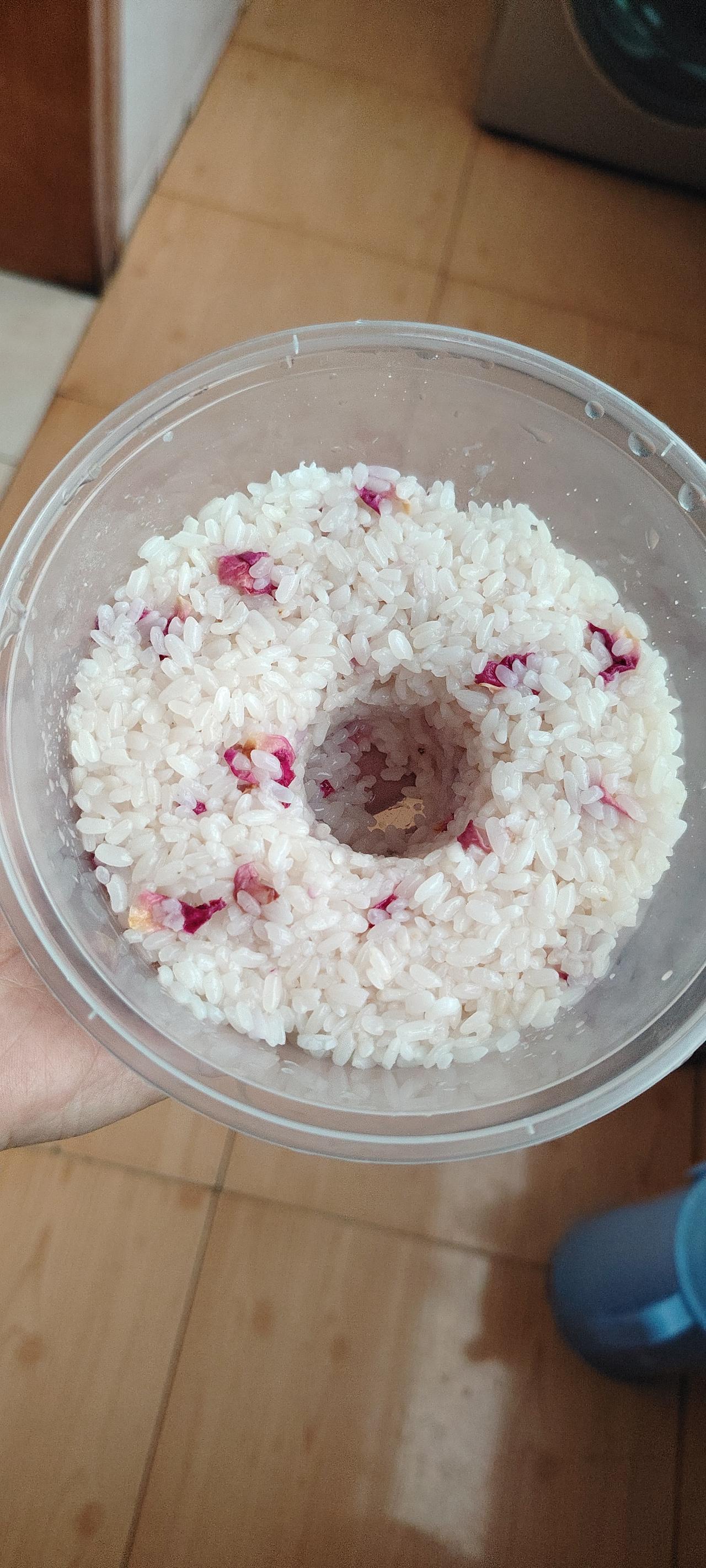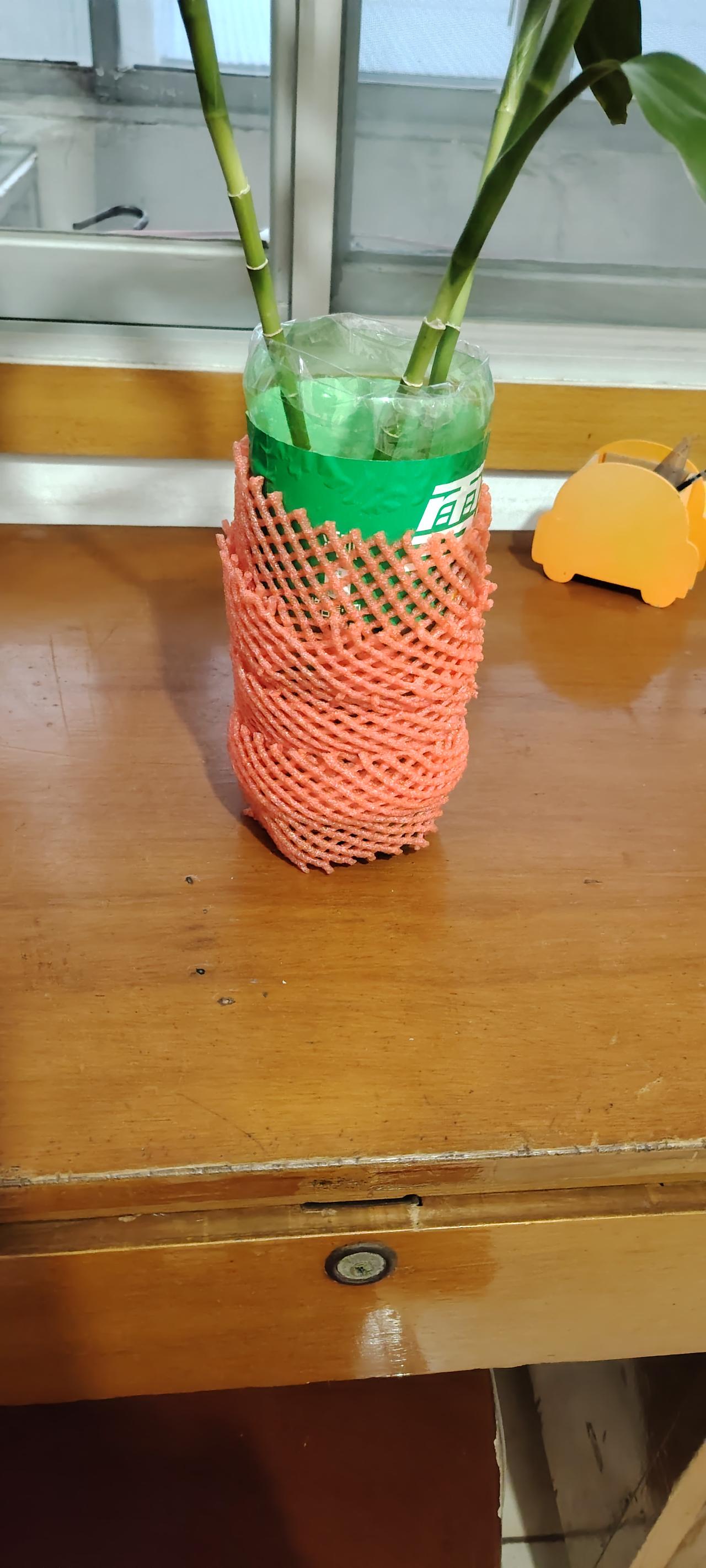 今早做了玫瑰花醪糟。玫瑰花瓣和糯米在最后时间蒸了五分钟,蒸过的玫瑰花瓣颜色更亮丽惊,花香浓郁,期待玫瑰酒酿成功。 接下来的事更有意义。最近温度骤降,最低温度可能到0度。我一直想给富贵竹整套毛线衣,可惜没有毛线针。有点着急,眼光偶尔瞟到桌上的苹果,有了,苹果套不就是富贵竹的保暖衣吗?说干就干,我给富贵竹套上了四个苹果套。瞧, 我的富贵竹能够安全的度过这个冬天吗?