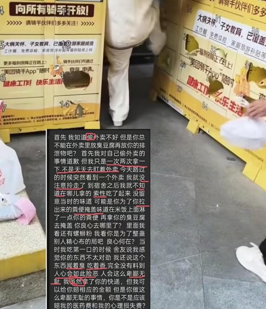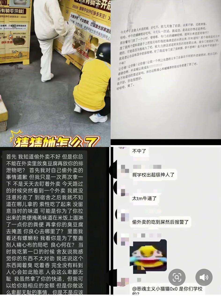 女大学生偷外卖不想却吃到粑粑,随后怒砸外卖柜,洋洋洒洒一篇小作文,还报警要求赔医药费和心理损失费…… 看到这小仙女写的小作文,真的是颠覆我们的三观,“我只是一次两次拿一下,不是天天去盯着外卖”,“我虽然拿了你的快递,但我可以赔付相应的金额,但你做这么卑鄙无耻的事情出来”,这都是什么逻辑啊?合着她偷人家的外卖没错,人家整蛊她却变成罪大恶极了? 不得不说,中国地大物博真的是无奇不有!!!