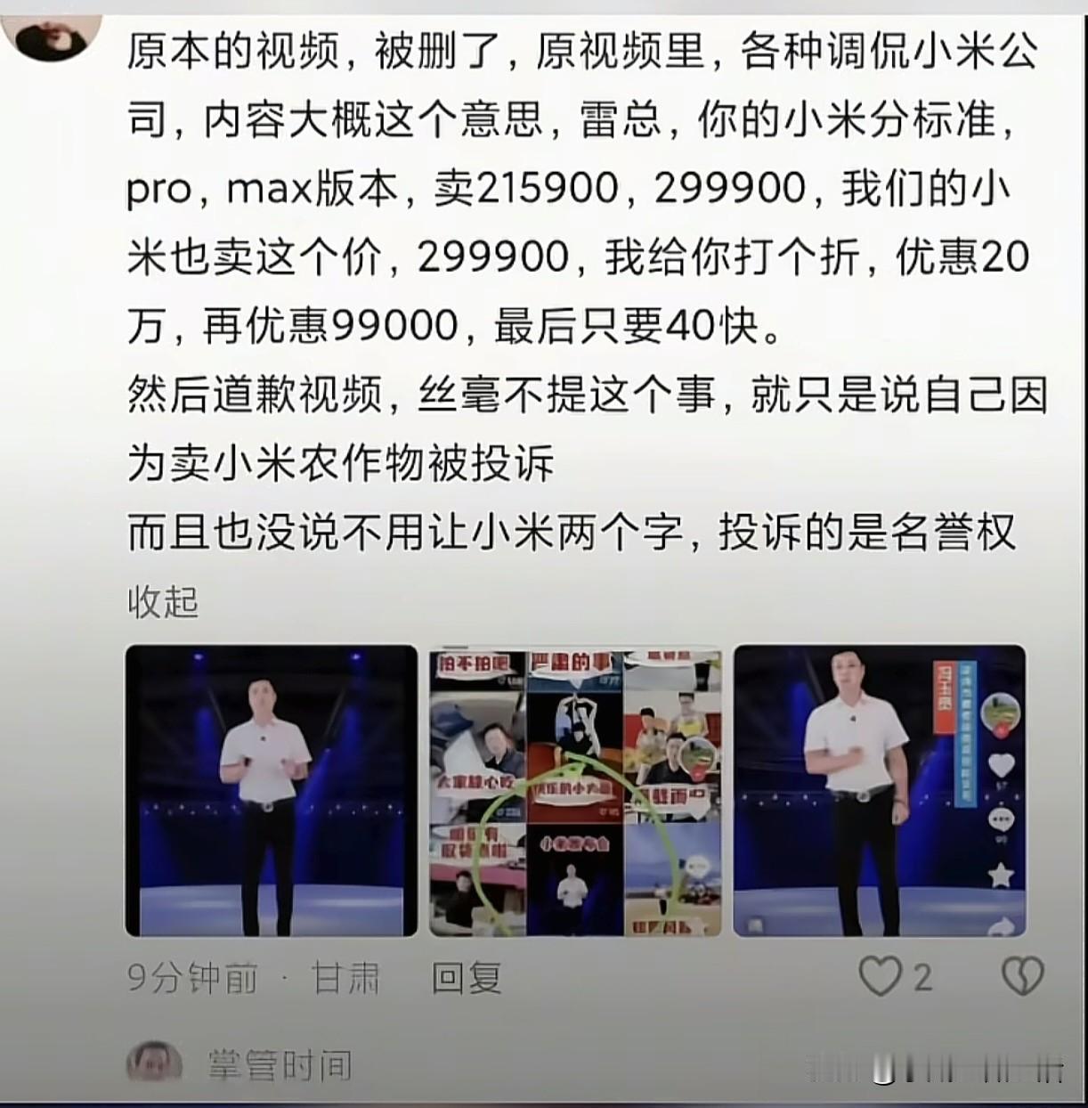 村支书卖小米被投诉一事反转了,一点都不冤! 并不是小米不让农民卖小米农作物,而是你要规范用词。 看过原视频就知道,该村支书明显剑走偏锋了,根本问题不是在卖小米上,而是他视频调侃了小米,属于偷换概念了。 网友表示:他蹭流量归蹭流量,但也要有个度,好端端卖个小米农作物,偏偏要带上雷总和小米汽车。 黑白无常追小米汽车都看过吧! 这阴阳暗讽明显过分过头了,后来他的道歉也没有诚意,明明投诉他的理由是以丑化高管形象,他却说不给老百姓一条活路,他的心思就不纯了。 因此,他被投诉一点都不冤。