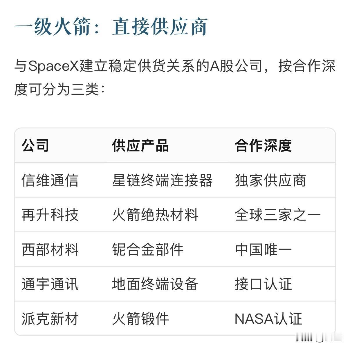 SpaceX史上最大IPO:A股概念股全图谱 SpaceX 2026年IPO估值1.5万亿美元,将催生史上最大IPO。A股330家商业航天概念股中,8家直接供应商和3类受益赛道 构成核心投资图谱。 一级火箭:直接供应商, 与SpaceX建立稳定供货关系的A股公司,按合作深度可分为三类: 信维通信:星链终端连接器,独家供应商 再升科技:火箭绝热材料,全球三家之一 西部材料:铌合金部件,中国唯一 通宇通讯:地面终端设备,接口认证 派克新材:火箭锻件,NASA认证。 二级分离:间接配套链, 通过产业链延伸切入SpaceX生态的A股公司,主要覆盖: 晋拓股份:通过台扬科技间接供应基站放大器,占基站成本30% 超捷股份:提供可回收火箭紧固件,2025年航天订单增长120% 斯瑞新材:铜合金材料已通过欧美认证,技术参数匹配星舰需求。 三级入轨:资本关联, 唯一通过股权投资绑定SpaceX的A股标的: 利欧股份(002131) 早年通过TBCA基金间接投资SpaceX,虽后续退出但保留"影子股"属性。2025年Q3净利润同比增长469%,当前市值仅反映机械制造业务,存在显著估值重估空间。 航天概念股 航空航天概念股 航天发展股票 SpaceX spaceX