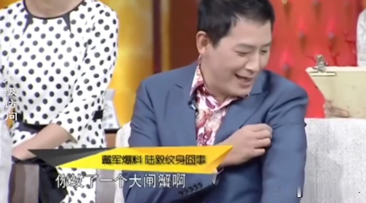 戴军说:“陆毅曾经在胳膊上纹了一只蝎子,后来拍戏的时候导演让他增肥,他就狂吃,有一次吃饭他穿着个跨栏背心就过来了,瞿颖看到他胳膊就问,咦,你纹了一只大闸蟹啊!” 确实,纹身后身材是不能胖,不然纹身都跟着变形,有个笑话说,有人因为情伤在身上纹了一个“恨”字,后来因为胖了,变成“小良”。