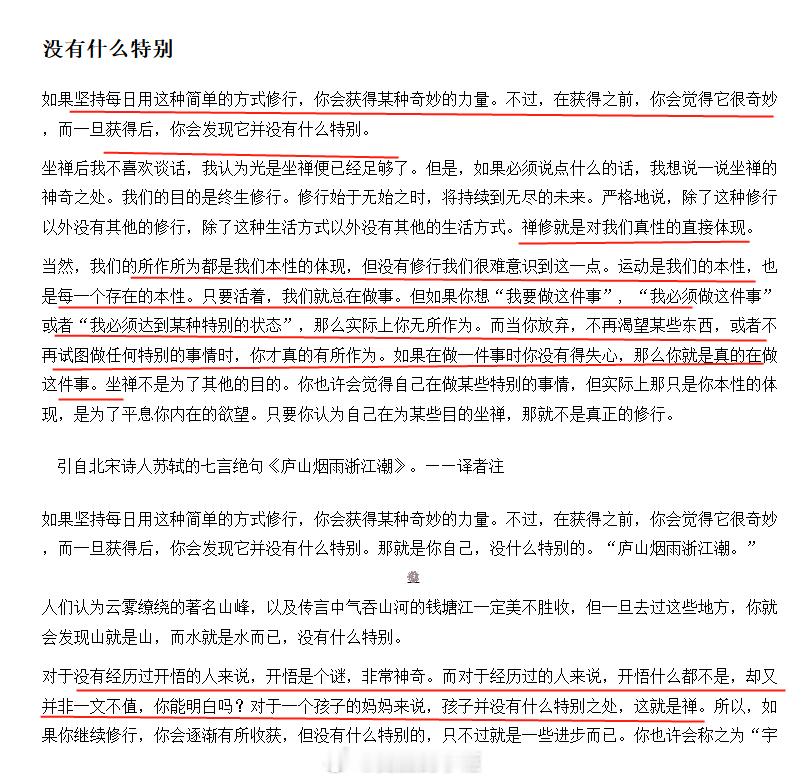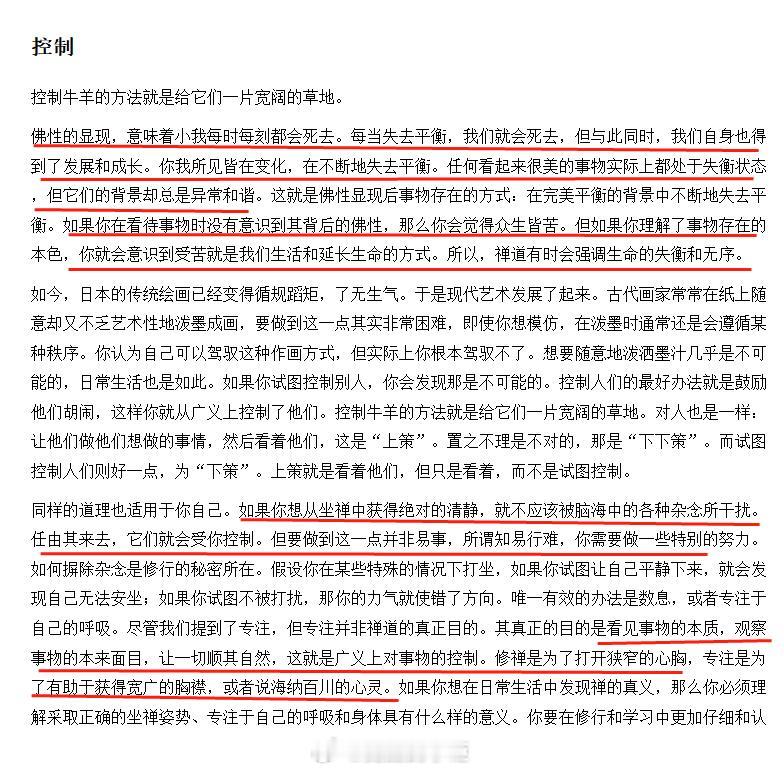 分享一本看完立马变得丰盈的经典好书——《禅者的初心》。书籍创作背景是二战后的经济腾飞的美国,此时人们的物质生活达到了前所未有的水平。但与此同时,精神危机也随之而来,内卷、精神内耗、人际关系冷漠、内心空虚...作者铃木俊隆用他们能听懂的语言,提供了一种“从根源上化解痛苦”的思维方式:痛苦不是来自没有得到,而是来自想要太多;不是来自生活太糟,而是来自我们看待生活的心态太拧巴。而这些问题,恰恰也是我们今天正在面对的——内卷、焦虑、内耗、精神空虚,半个多世纪过去,人类的精神困境几乎没有改变。整理了书中的一些金句,给大家做个参考:1、禅的核心,就是保持初学者的心态,一种让你在当下活得专注、不被过去纠缠、不被未来焦虑,平静、不内耗的方式。2、当你吃饭的时候,就只是吃饭;当你走路的时候,就只是走路;当你工作的时候,就只是工作。不要让你的心‘跑掉’,不要一边做这件事,一边想那件事。3、初心,就是初学者的心态。初学者面对任何事情,都带着好奇、专注和敬畏,没有偏见,没有杂念,没有‘我已经知道了’的傲慢。而我们成年人的痛苦,恰恰是因为失去了这种初心。4、内耗的根源,是你的心‘跑掉了’—— 身体在当下,心却在过去或未来,就像一个人同时走两条路,怎么可能不累?5、痛苦的根源,是你不接纳自己的本来面目。禅的智慧,就是让你接纳自己 —— 接纳自己的缺点,接纳自己的平凡,接纳自己的不完美。6、生活本来就是不完美的,有好有坏,有顺有逆。你不需要追求‘事事完美’,只需要以平常心对待:好的时候不狂喜,坏的时候不焦虑。7、欲望本身不是坏事,坏的是‘无节制的欲望’——想要更多钱,想要更高的地位,想要别人的认可,想要的太多,心就会被欲望填满,再也装不下快乐。8、如果你想,我要做这件事,那么实际上你无所作为。而当你放弃,不再渴望某些东西,或者不再试图做任何特别的事情时,你才真的有所作为。如果在做一件事时你没有得失心,那么你就是真的在做这件事。9、如果你能抱着“不图成就”的精神去做事,就能将一种良好的品质融入进来。平平常常做事即可,不需要投入特别的努力。一旦你付出特别的努力去获得成就,就会将一些额外的品质和额外的元素融入其中。10、尽量不要看特别的东西,也尽量不要谋求什么特别的成就。你已经拥有了纯粹的品质,这就是拥有一切。如果你了解这个终极事实,那便可无所畏惧。如果你每天正被“忙到疲惫却没成就感,被柴米油盐磨得没了耐心,家庭关系紧张,觉得自己不够好、没价值,不知道自己真正想要什么”这些痛苦困扰,不妨翻开这本穿越了半个世纪依旧畅销的作品,一定能让你的心灵得到平静和力量。她说世界觉醒读书会女性成长
