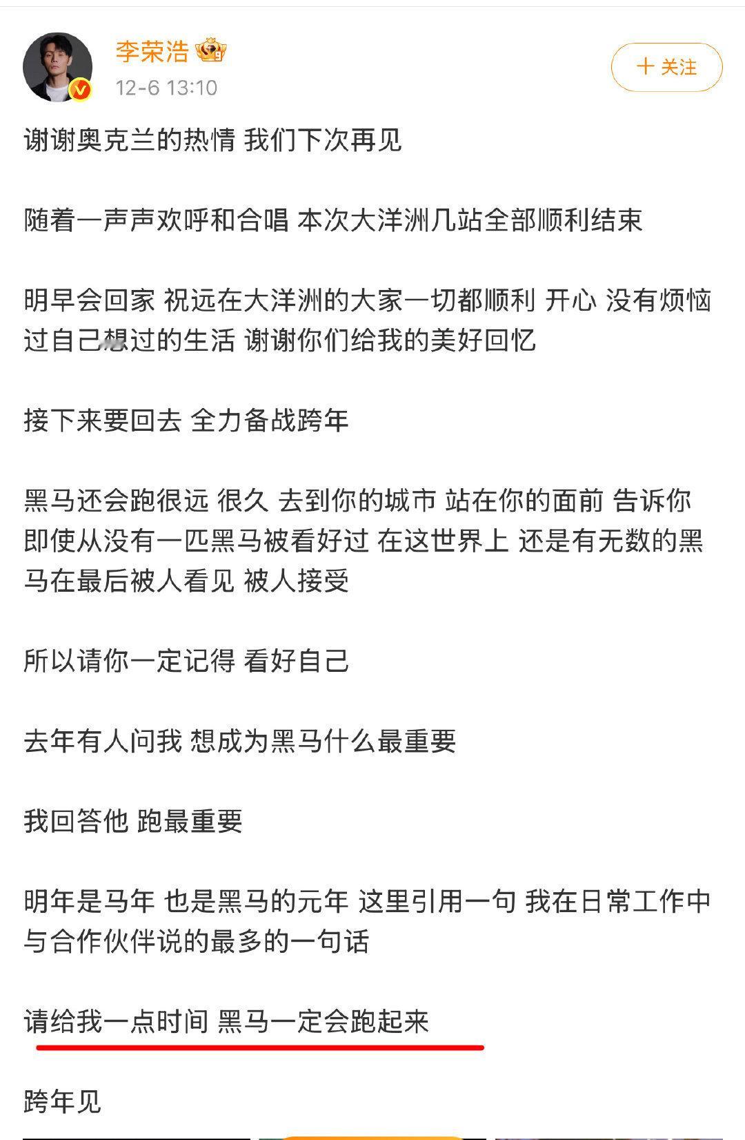 李荣浩说到李荣浩做到李荣浩去年说“黑马一定会跑起来”,今年就真的实现了,这超强